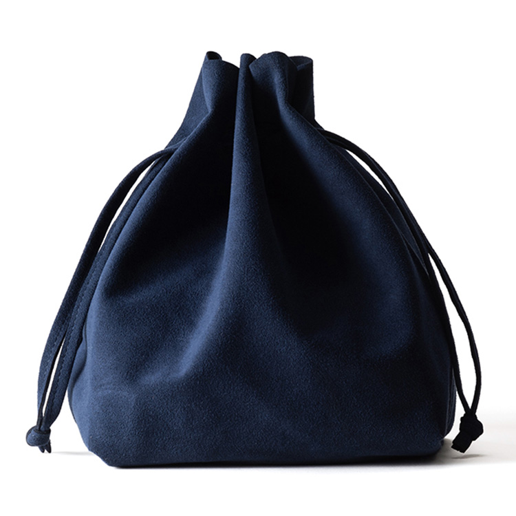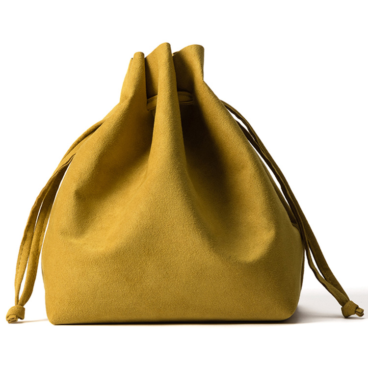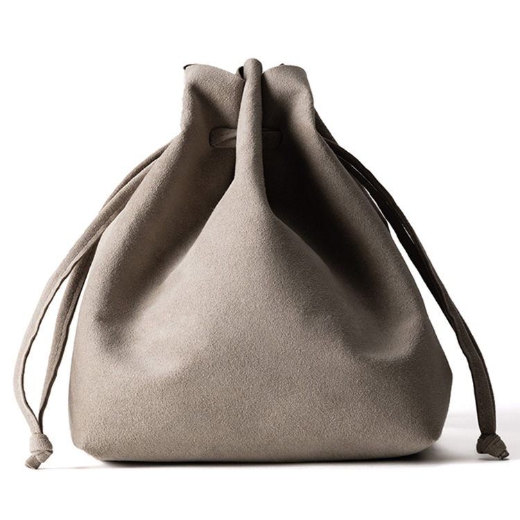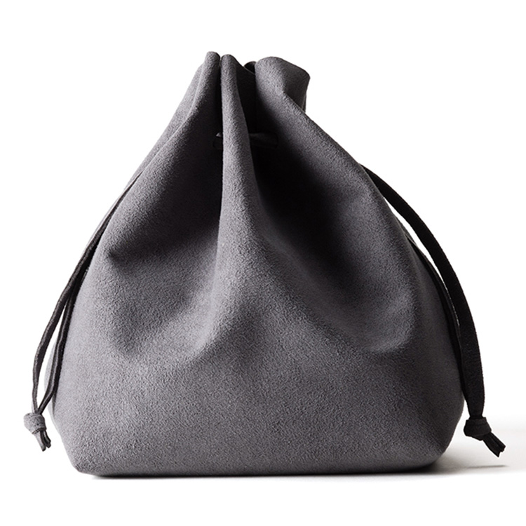 しっとりリッチな風合いの巾着バッグは、お散歩のお供に◎。丸洗いOKなマイクロファイバースエード製で、重さはたったの100g。カジュアルなスタイルはもちろん、和装に合わせても素敵。
