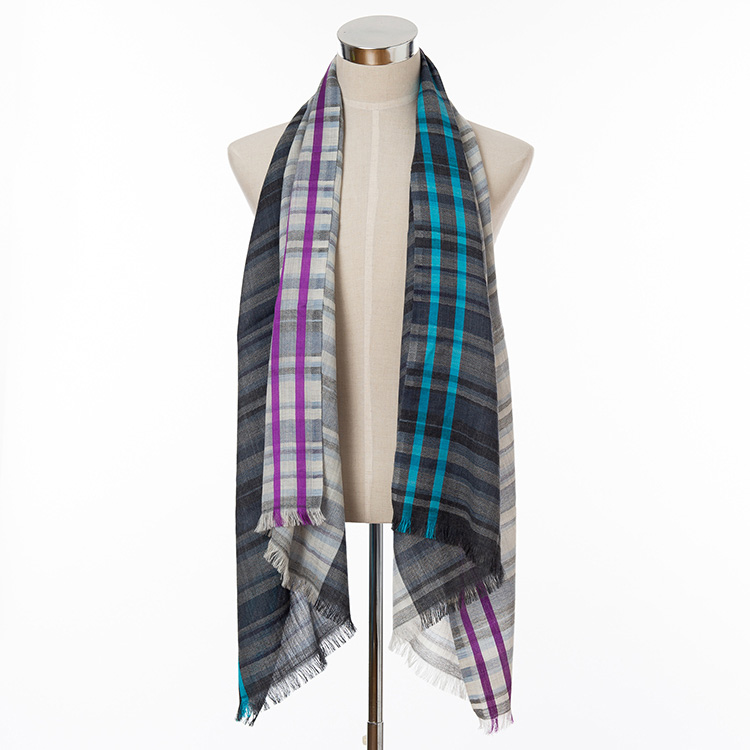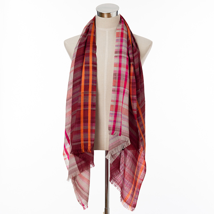 マハラジャ王宮御用達「オージャソン」がおくる、ウール&シルクの上品ショール。高級感のあるヘリンボーン織に、カラフルなチェック柄が躍る楽しげな一枚。小さく折り畳めるのも嬉しい!