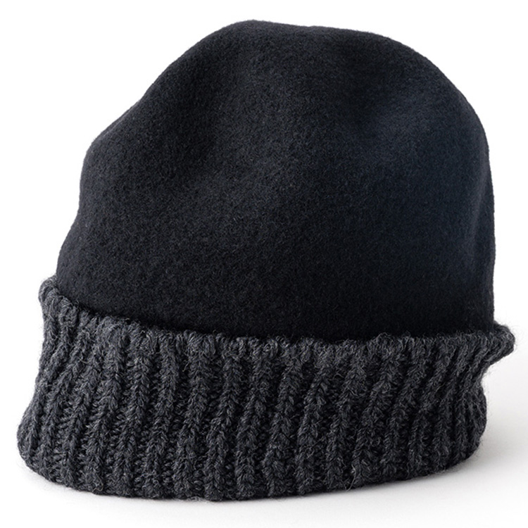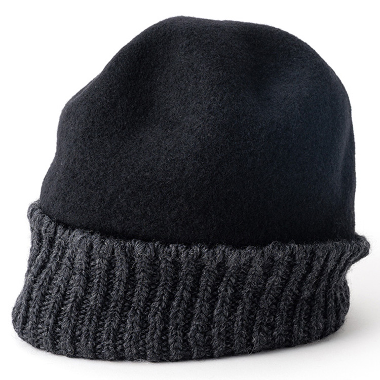 ウォッチキャップのようでいて少し違う!リブ編みウールと圧縮ウール、2つのウール素材をミックスしたユニークなカジュアルキャップ。リブの折り返しを調整することで被り方を自由にアレンジできる。小さくたたんで持ち歩けるのも便利!