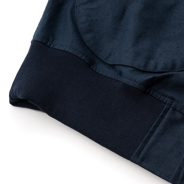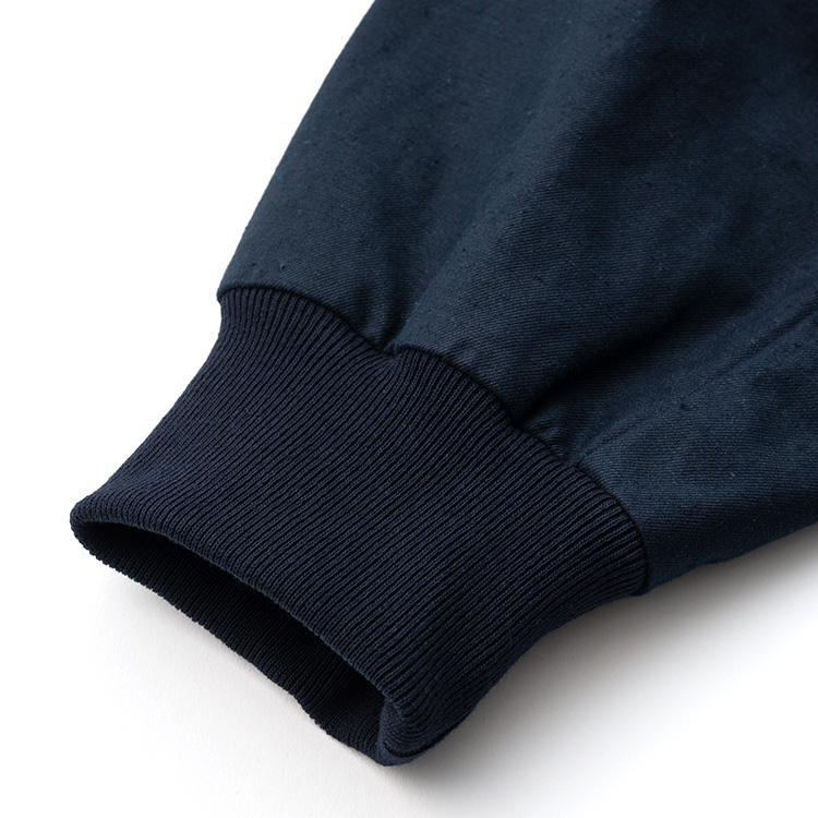 襟・袖・裾のリブは綿100%であたりが柔らかい。裏地無しの一枚仕立てで羽織り心地も軽々だ。