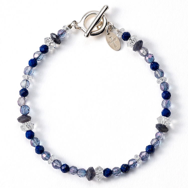 「重厚感がある石なので、普段の着こなしに溶け込むようなデザインを心がけました。石は4mmサイズでほどよいボリューム感に。ラピスラズリやクリスタルを合わせることで、軽やかな印象にしました。“お守り”としての意味合いも持たせつつ、ファッション小物としても楽しめる仕上がりになっていると思います」。