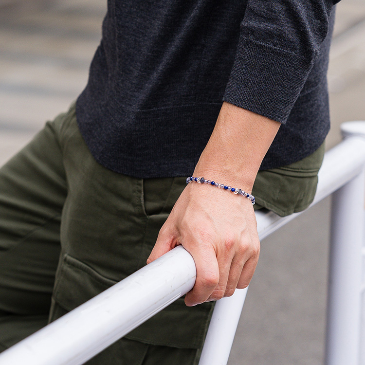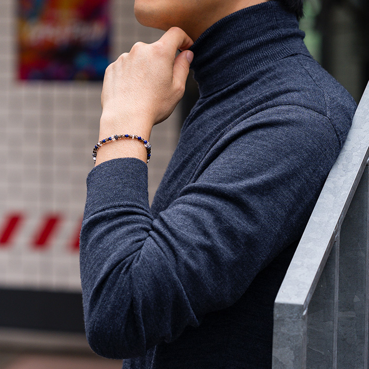 ラピスラズリやタイガーアイといった天然石にカッティングが施された程よい4mmサイズを採用。派手すぎない細身のデザインなので、さらりと着けられて、さりげないオシャレが楽しめる。ジャケットの袖口からチラリとのぞかせるのも色っぽいし、デニムスタイルに合わせてもすんなり馴染む。ユニセックスなデザインで汎用性の高さが嬉しい。