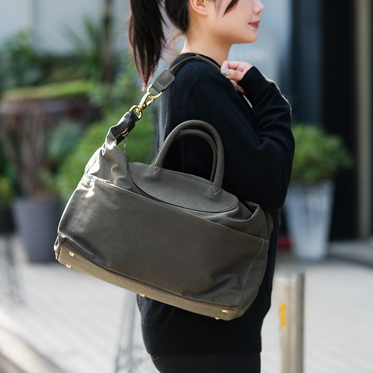 旅行など荷物が多い日は、ロングショルダーで斜め掛けすることも可能。その日のコーデや荷物の量に合わせて、持ち方をカスタムできる。