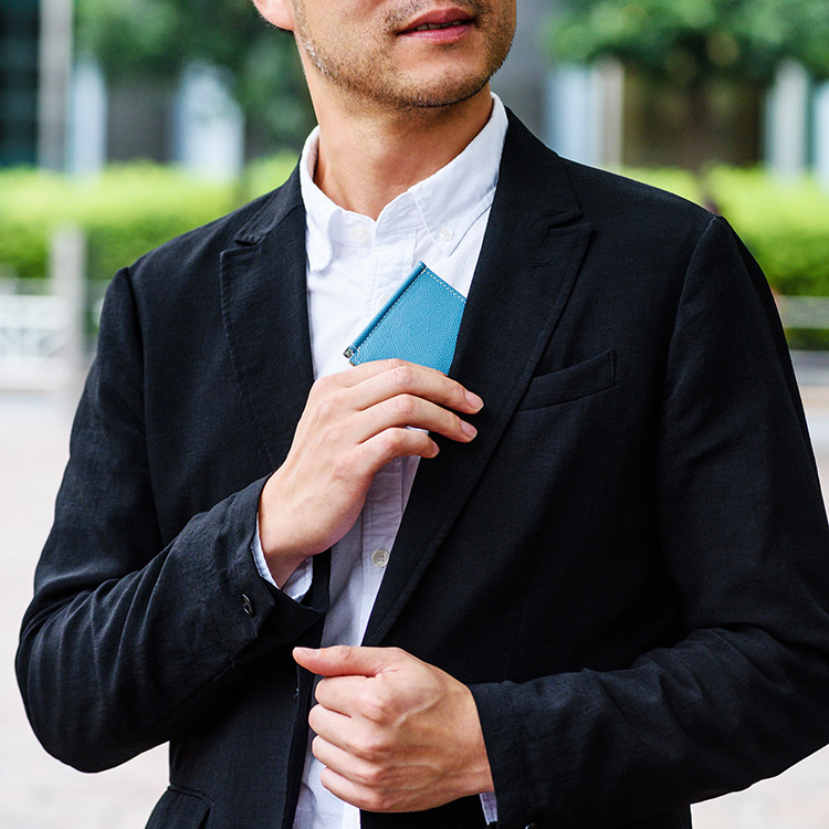 実用性を突き詰め、キャッシュカード、クレジットカード、ICカードを入れることを想定した数にしたという。左側のアオリには、新幹線のチケットや駐車券をはさむことも可能。スマートながらお札は約15枚入り、容量も申し分なしだ。