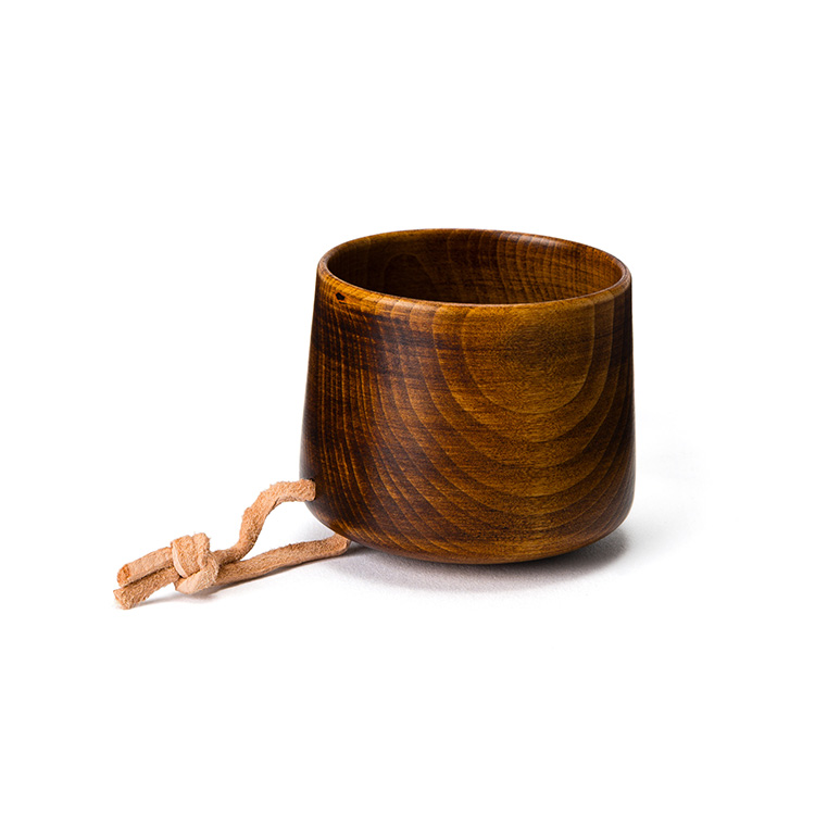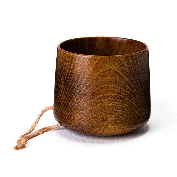 NODATE yokokiはそのプレーンなカタチも魅力だ。やや上にすぼまった形状で、茶椀や湯呑みと同じような持ち心地。底は高台が付かず、やや丸みを帯びている。これは、アウトドアでは平らな置き場所があるとは限らないため、あえて丸くすることで着地性を高める工夫だ。テーブルに置いても揺れすぎることはないので安全。口縁は薄く仕上げており、飲み心地もグッドだ。ヘラジカ革のストラップが付属し、バックパックに吊り下げられるのもアウトドア的