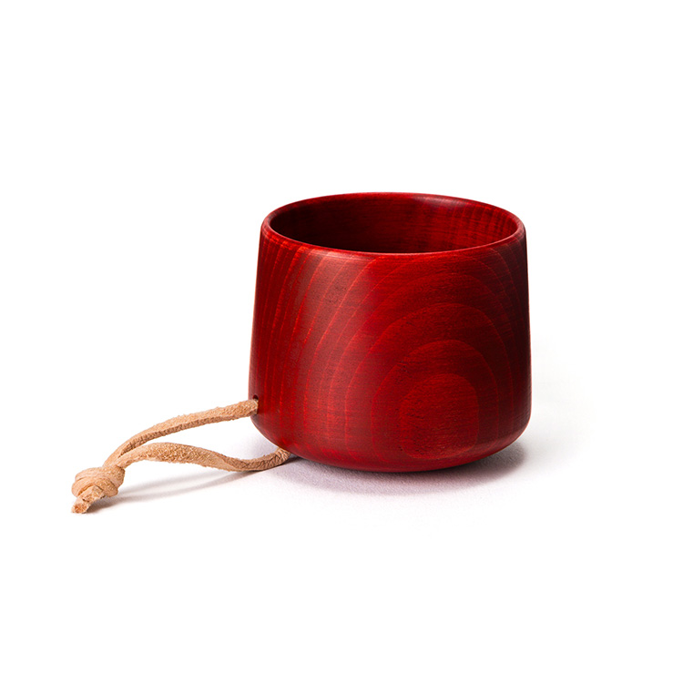 漆器だからといって日々の特別なメンテナンスは不要で、使ったら手洗い&自然乾燥でOK。普通の食器と同じ扱いで済むのは気が楽だ。より長持ちさせたいなら手洗い直後に水分を拭き取るといい。アウトドアでは、付属のヘラジカ革ストラップを木などに引っかければ口が下を向くように設計しているので水切れに便利。長いストラップを用意して首や肩からかけたりするのもアリだ。