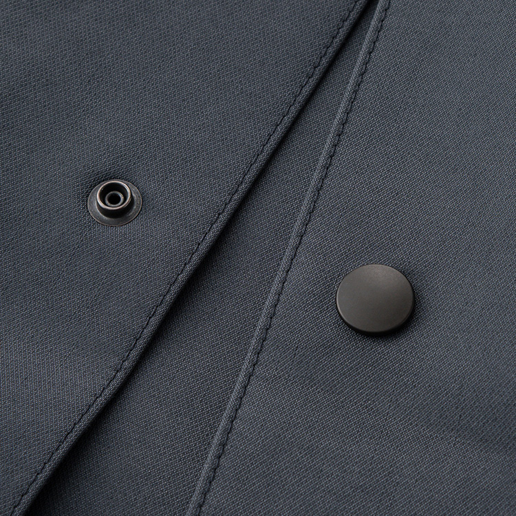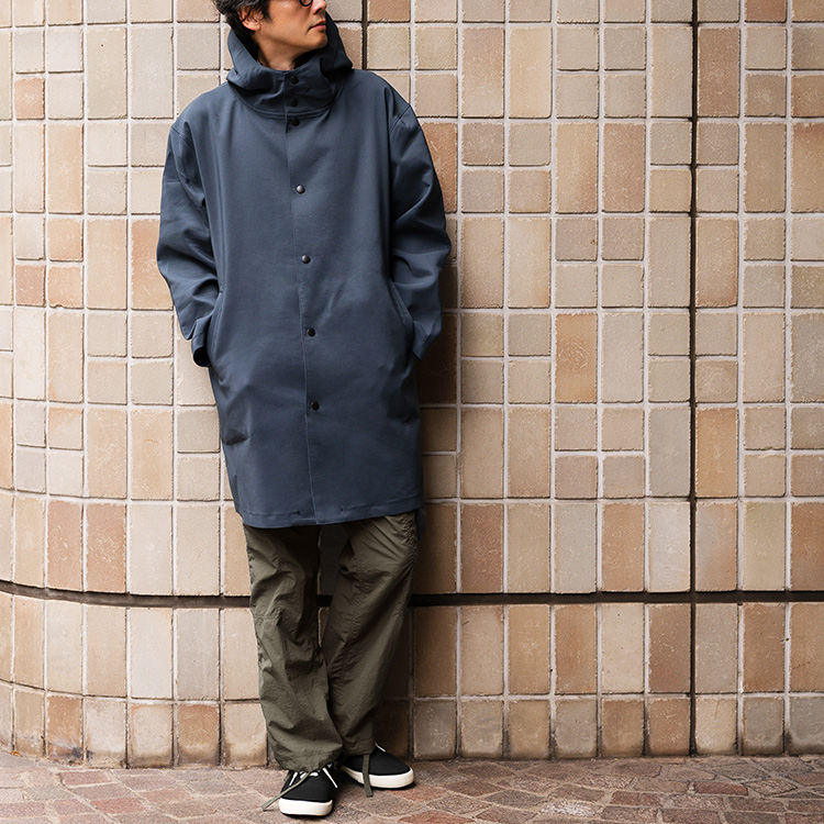 そして独特な素材感にも注目。ややヌメっとした光沢があるこちらは「トリプルクロス」と呼ばれ、ストレッチの糸と50/2の太番手の綿糸を高密度に交織した肉厚生地だ。ポリエステルの防風性やほどよい光沢感を前に出しつつ、綿由来の自然な風合い・自然なタッチ感を兼ね備えていて、これを全面に使ったことでなんともリッチな見え方のコートになった。光の加減やシワの入ることで放たれるヌメり感が実に大人っぽい