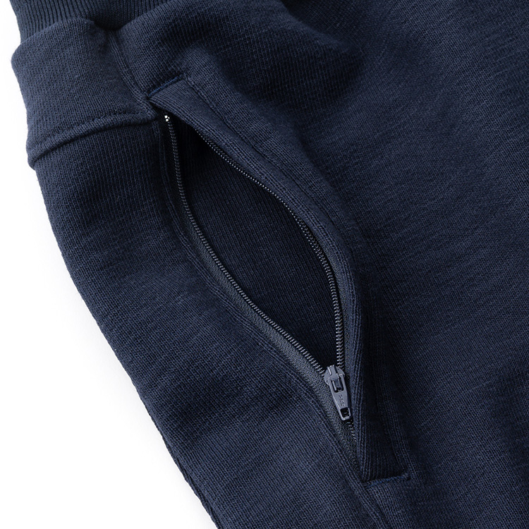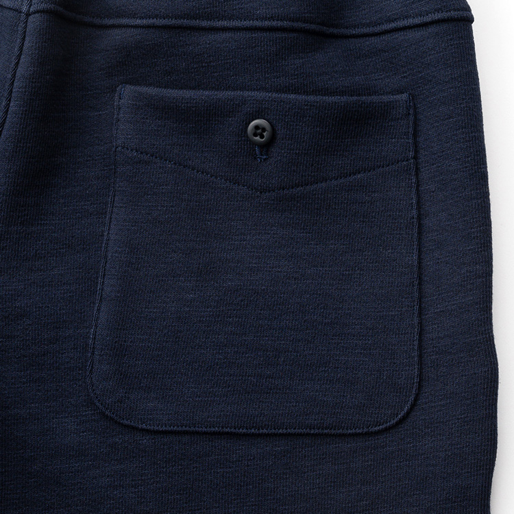 サイドポケットにはジップファスナー、ヒップポケットにはボタンを取り付けた。部屋着やパジャマになりがちなスウェットパンツだが、あくまでもこちらは外で使ってほしい意図をここに込める。
