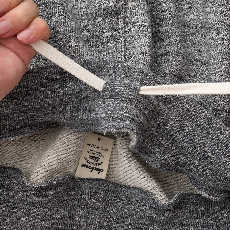 素材は、ジャックマンのスウェットアイテムではおなじみのオリジナルの綿100%素材「GGスウェット」。GGとは「ガラガラ」の意味で、杢の濃淡差が強い粗挽きな風合いからネーミングされたという。表10番、中20番、裏7番手と3種類の国産糸を使い分けたムラ感豊かでナチュラルな表情と、重厚で肉厚な素材に包まれる感覚は、他にはない唯一無二の特徴だ。