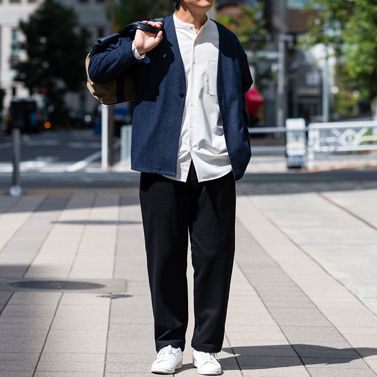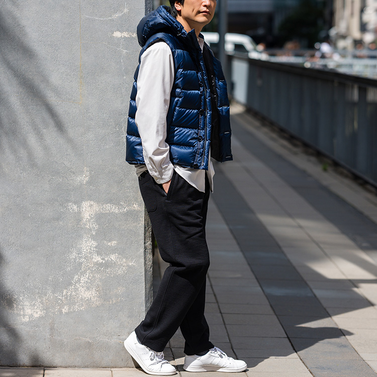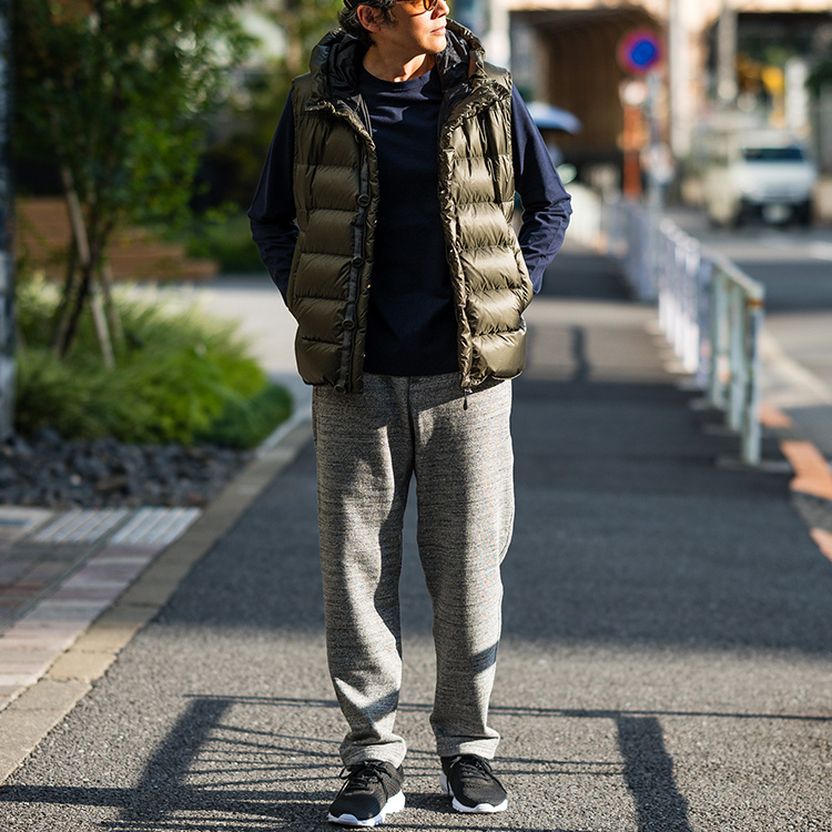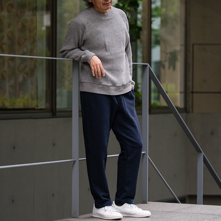 ジャックマンのロングTシャツやワッフルミッドネックなどとの相性は言わずもがな。ぽってりとしたボトムラインが全身を自然に雰囲気よくまとめてくれる。このバランスは仕事着としてもぴったりで、ジャケットと合わせてオフィスカジュアルに使う方もいるとか。確かにこんなきれいめシルエット&きちんとスウェットならだらしなく見えない。