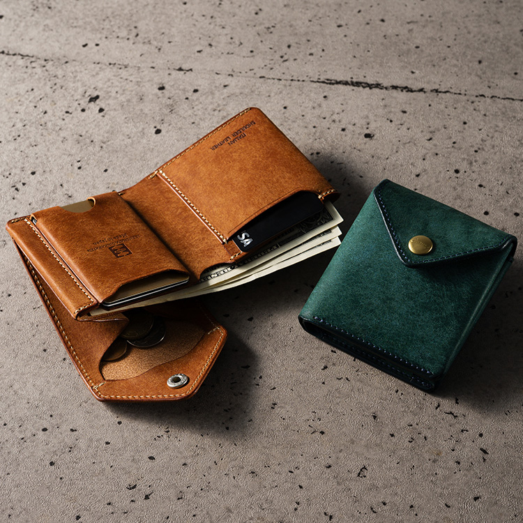 「商品に愛着を感じながら、すべての工程を手作業で行っているんです」。そう語る宗川氏は、愛すべき商品に思いを込める。「使う人が“修理をしてでも長く使いたい”と思えるモノを発信し続けていきたいです。私が革を選ぶ理由のひとつに挙げるポイントは、経年変化の仕方です。エイジングによる色褪せやくすみがなく、使い込むことで光沢と美しさが増していく革を使い、加工をほどこしています」(宗川氏)。イタリアのトスカーナ地方で作られた最高級の植物タンニンなめし革を使用したしなやかな革小物は、人の動作に寄り添い、エイジングとともに個性を発揮していくのである。