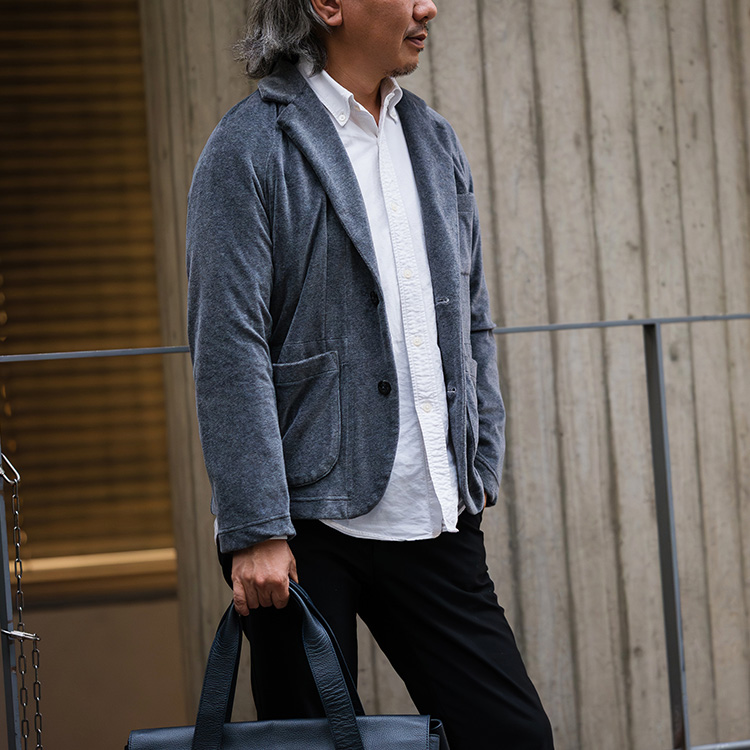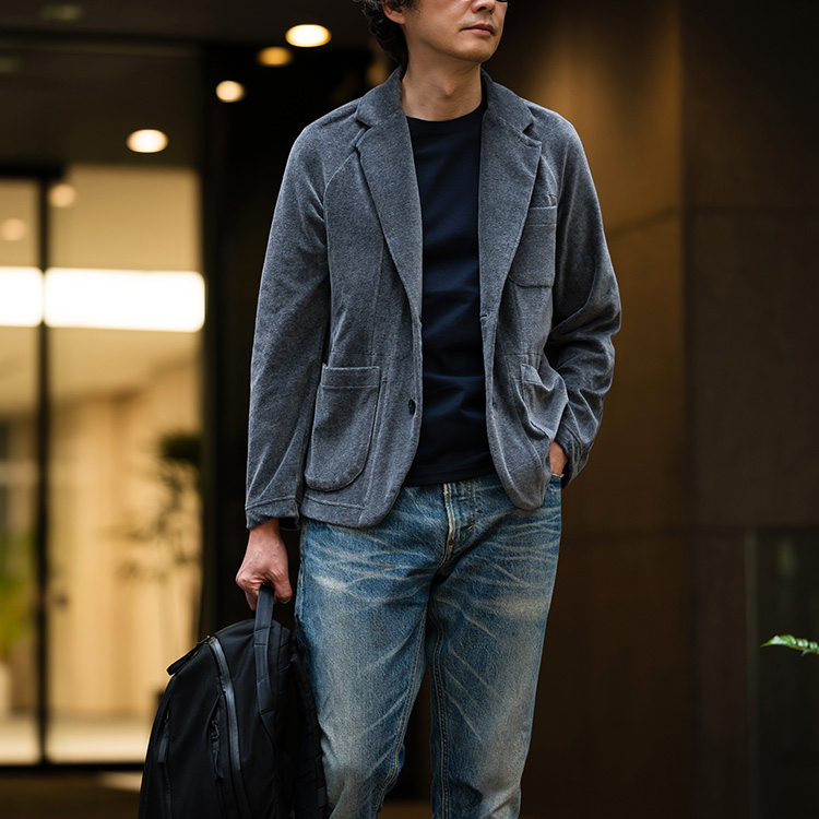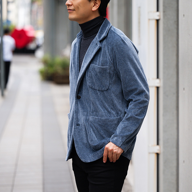 DOPE&DRAKKAR流、高級ベロアのジャケット仕立て。ふわりと軽く、きちんと見えるビジカジの救世主!
