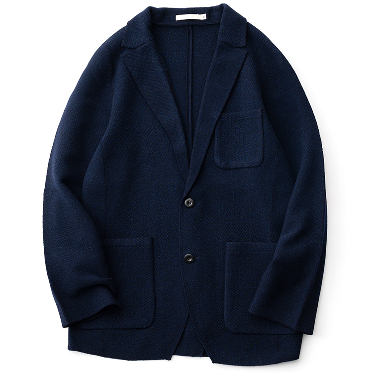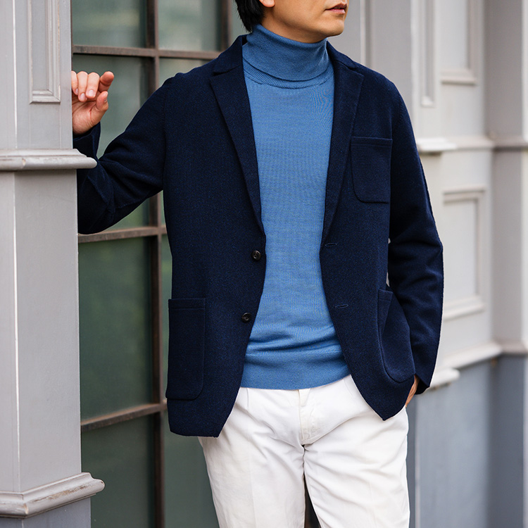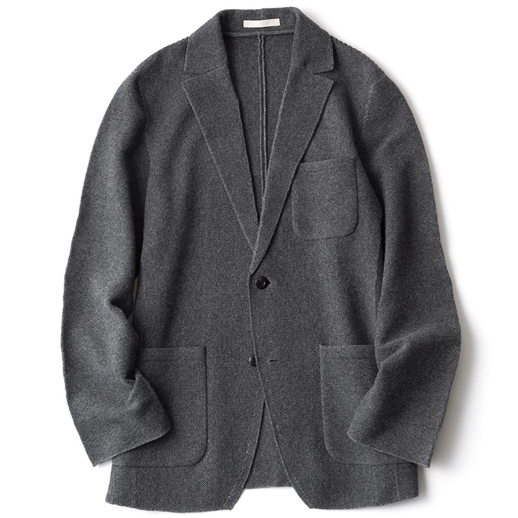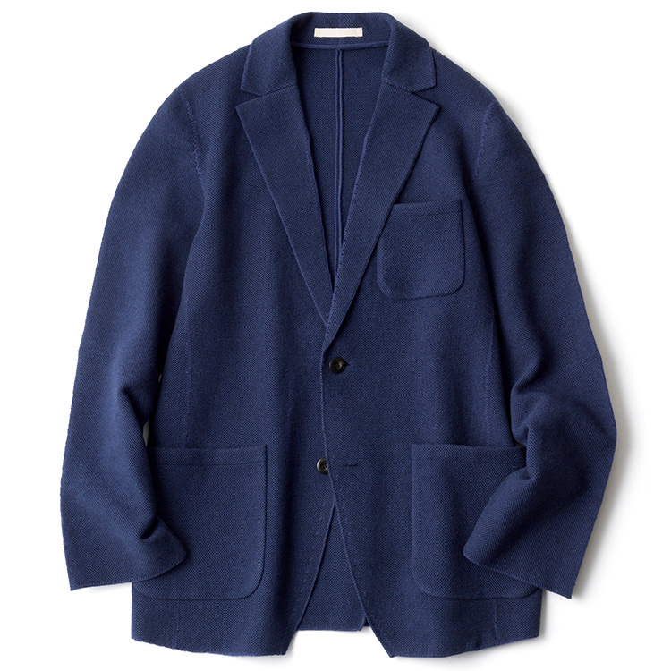 ニットの特性として、ザッと手で持ったり、バッグにしまい込んだりしてもシワにならないというのも大きなポイント。移動中に暑くなってカバンにしまっておいて、到着したらサッと羽織るというのも見事に成立するわけだ。現代の室内と室外は気温差が激しくなりやすいだけに、気軽に運べて、脱ぎ着しやすいこのジャケットは、誰もが重宝してしまうに違いない。