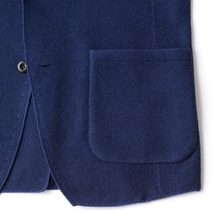 元来、ニットは編まれているものであるだけに、時間とともに伸びてしまい、だらりと型崩れしてしまいやすい。だが、このジャケットにおいては心配無用!一方向にしか伸びないという特殊な編み組織を採用しており、身頃はヨコ方向に、袖はタテ方向にのみ伸縮し、常に身体の動きにフィットしつつ、型崩れ防止を実現しているのだ。