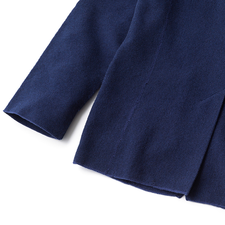 そして今回、同社が手を組んだのは日本の高級ニットの産地として名高い新潟県五泉市の中心的メーカー「株式会社川島」。数々のハイブランドのニットを生産してきた歴史と高い技術を持つ同社の全面協力を得て、身頃の脇やアームホール、袖などに縫製を必要とせず、一体型に編み上げる立体成型のニットジャケットが完成させた。
