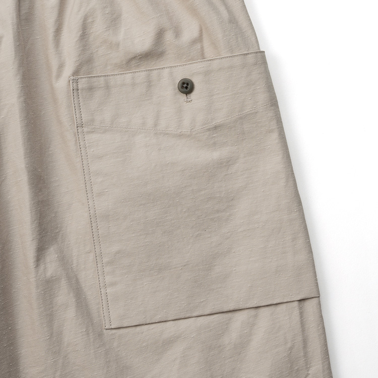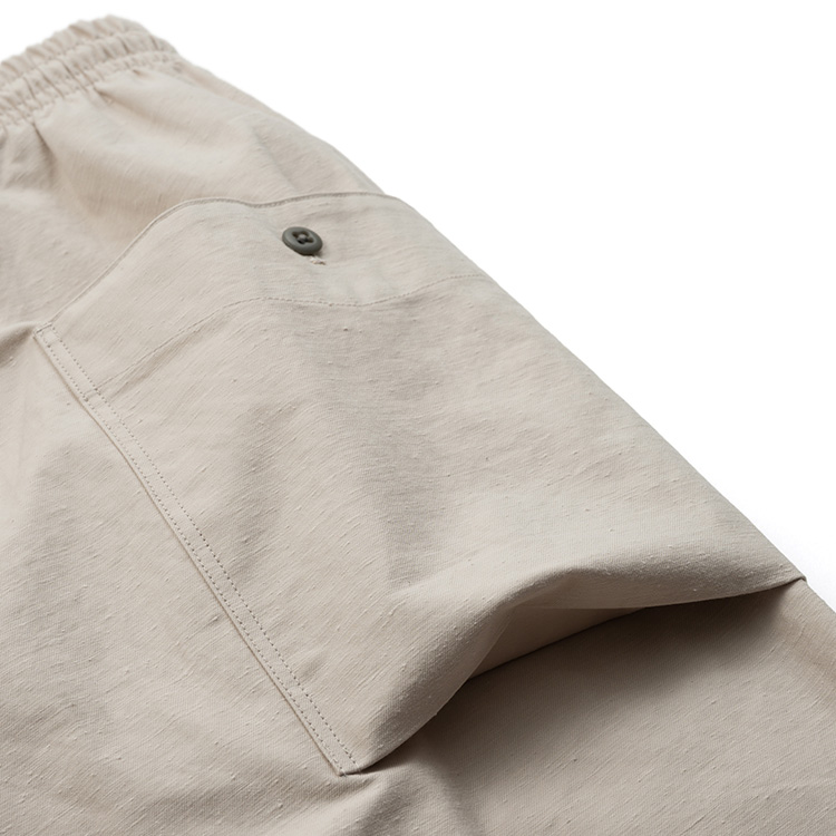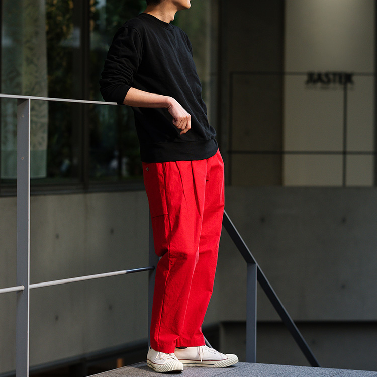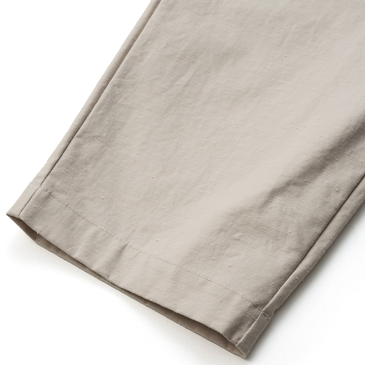 ワタリから裾にかけて幅が狭くなる形は脚をきれいに見せるばかりか、軍パンのような動きやすさも生まれる。ここにツイルなのに涼しいという特徴を持たせることで、イージーに履けるのに上質感がある特異なパンツができ上がった。
