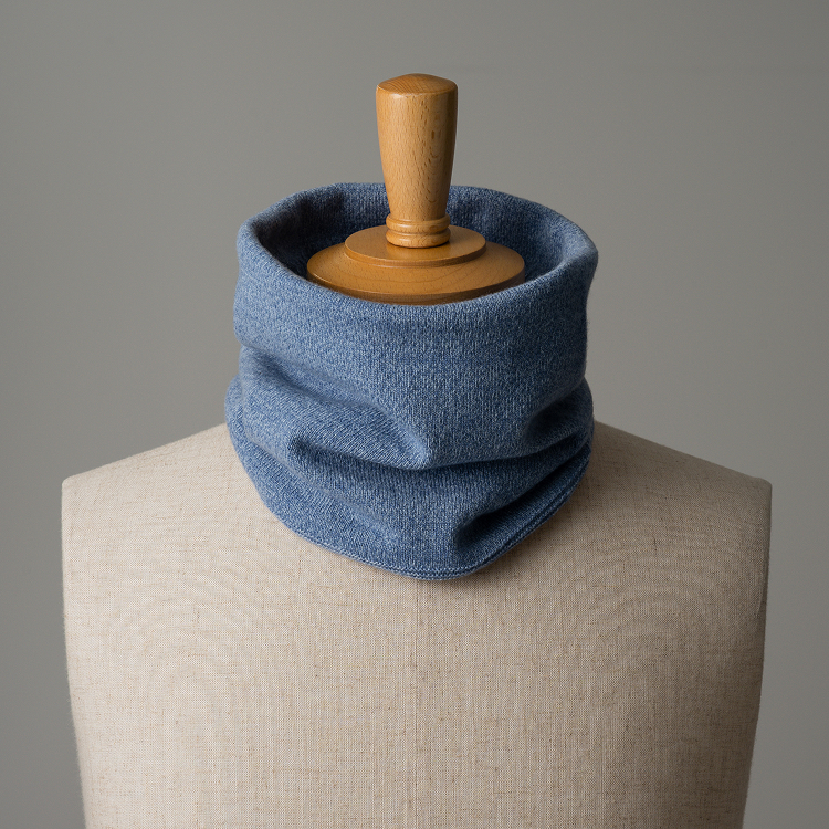 片方が窄まった、フシギな形状のネックウォーマー。実はこのカタチこそが、本品の肝である。使うときはリブ編み側からすぽっとかぶり、天竺編み部分を外側に折り返せばOK。内側は首元にフィットするため暖かく、外側では美しいドレープ感を楽しめる。継ぎ目なしで一気に編み上げているためゴロツキもナシ。端の部分は天竺編みからガーター編みへグラデーションさせることで、くるんと捲れてしまうのを防いでいる。ニットの特性をすみずみまで生かしたつくりには脱帽である。
