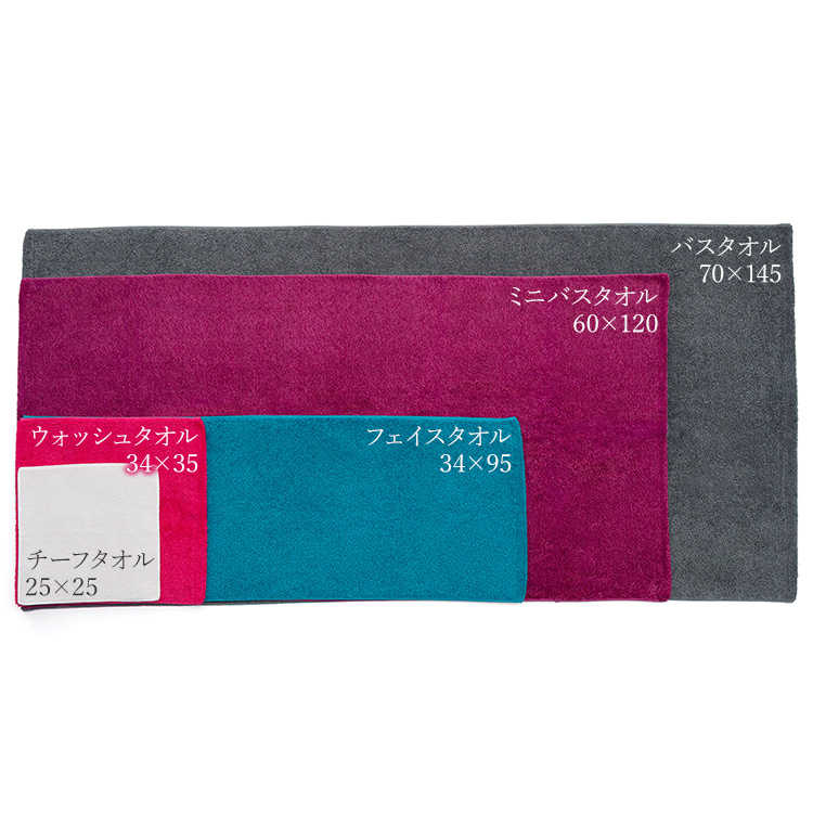 タオルは、「チーフタオル」「ウォッシュタオル」「ロングフェイスタオル」「ミニバスタオル」「バスタオル」の全5サイズ展開。用途に合わせてお気に入りの一枚を見つけてほしい。