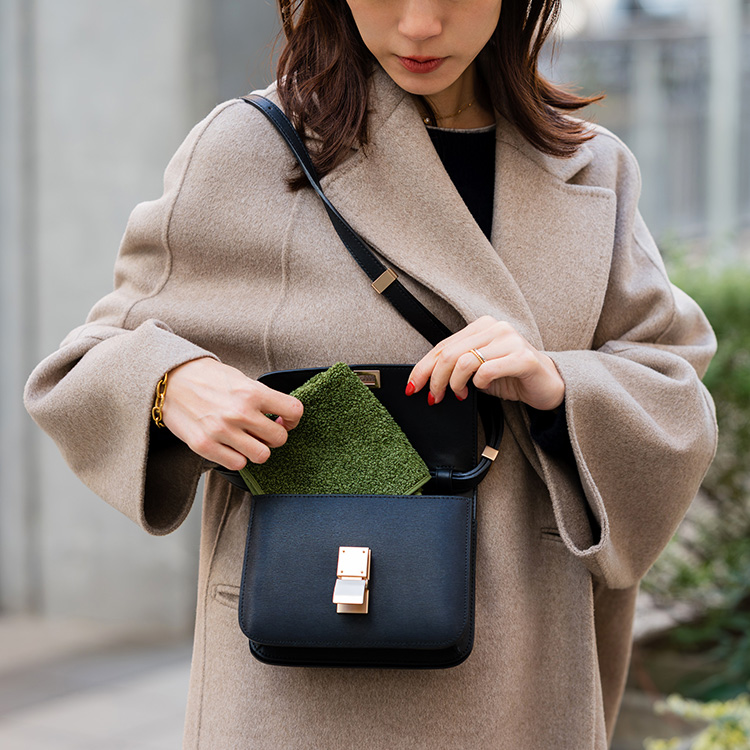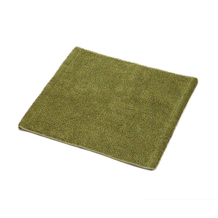 タオルハンカチに最適なサイズ。ショートパイルの生地はポケットに入れても膨らみにくく、バッグに入れてもかさばらない。ヒップポケットからチラリと覗かせるのもアリ!