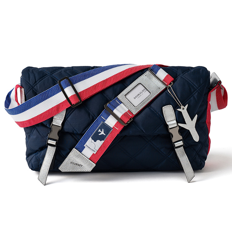 DOUBLELOOPのバッグに通底している「旅」というテーマ。「ネイビー×フランス」「スカイブルー×アルゼンチン」には飛行機の旅、「ブラック×モノトーン」「オレンジ×モノトーン」「グリーン×モノトーン」には宇宙旅行をイメージしたブランドタグがあしらわれている。ベルトの剣先は、飛行機の尾翼をモチーフにしたもの。スーツケースベルトに合わせて特注した金具には、DOUBLELOOPのロゴマークが!