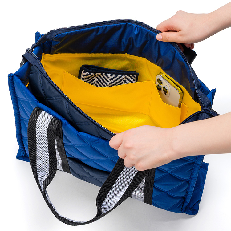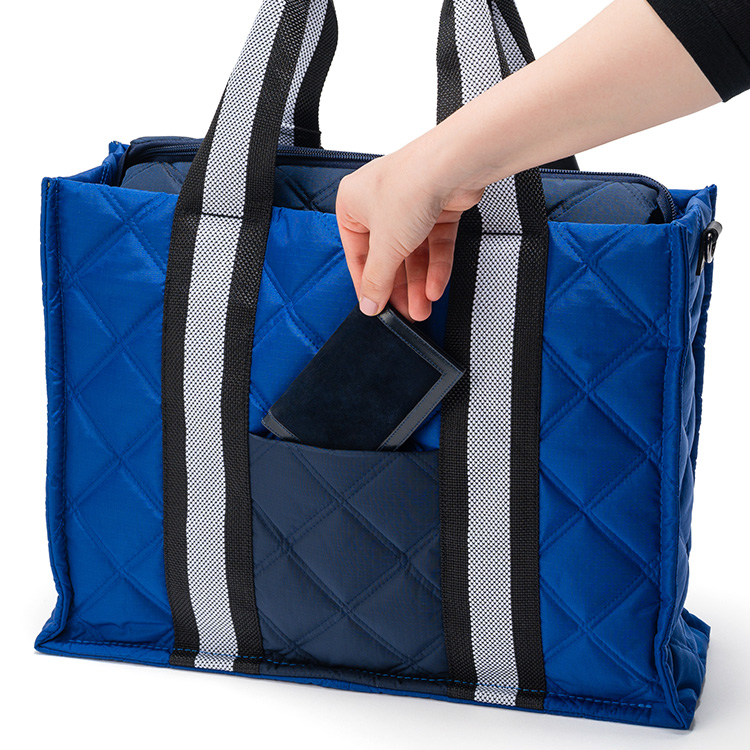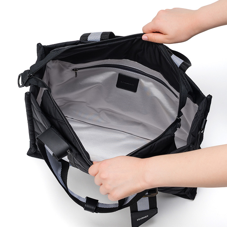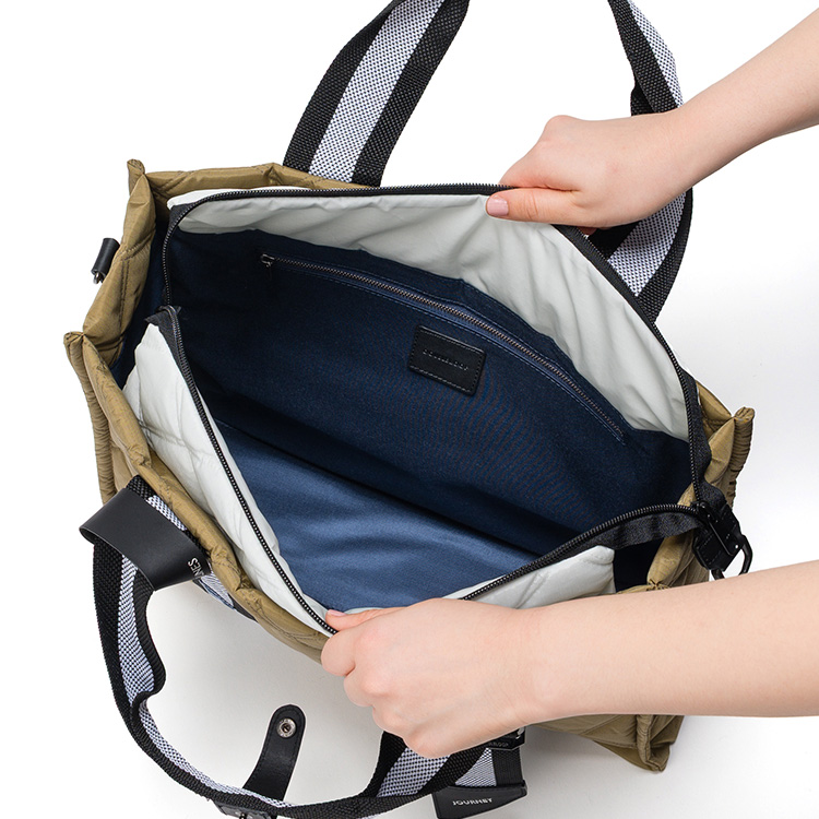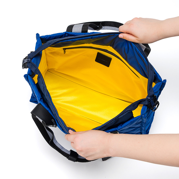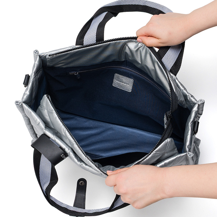 特徴的なのが、天面のマチ付きファスナー。中身が丸見えにならず、防犯面でも安心。荷物の落下防止にも一役買ってくれる。