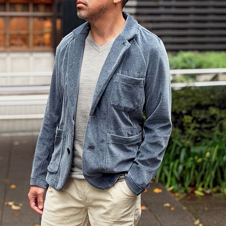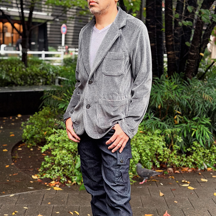 今回は長い毛足と光沢感が特徴のベロア素材。ベロアのジャケットはかっちりめに着こなすイメージがあるが、それとは真逆の柔らかな着心地が特徴で、Tシャツや長袖シャツの上にサッと羽織るだけで柔和なビジカジスタイルが完成する。秋や春の季節の変わり目に、そして本格的に寒い冬に、大活躍してくれそうなモデルだ。