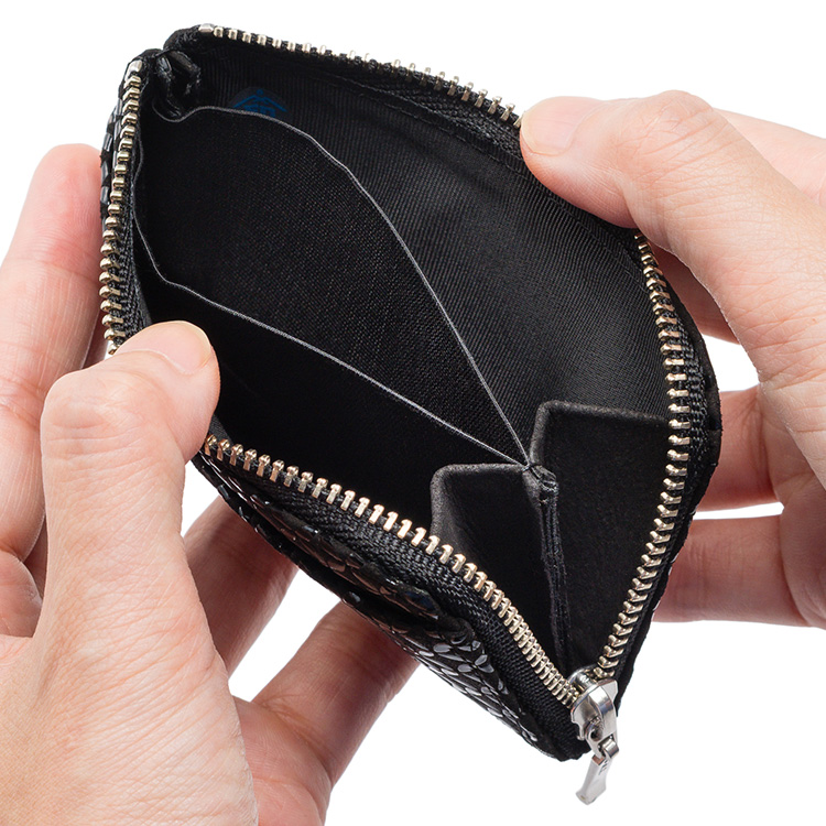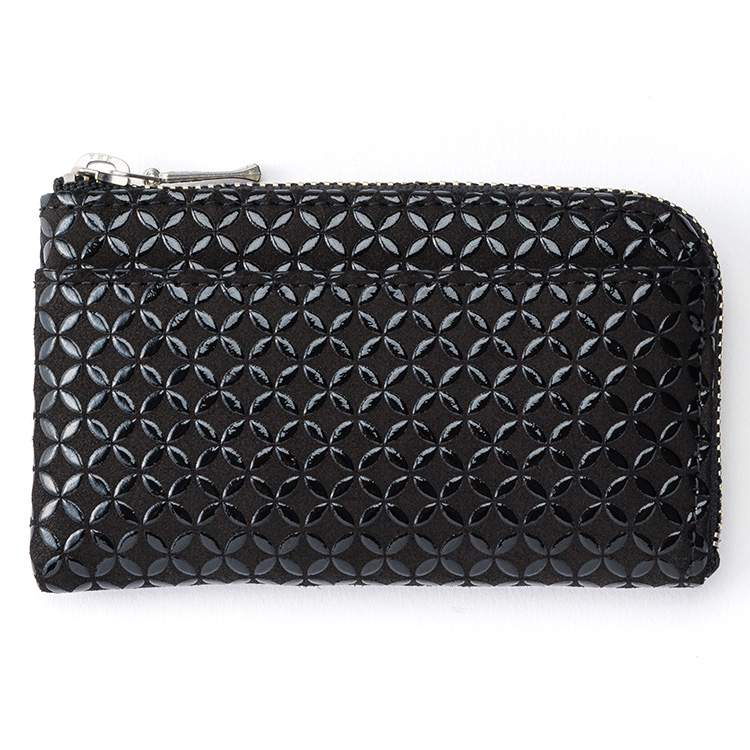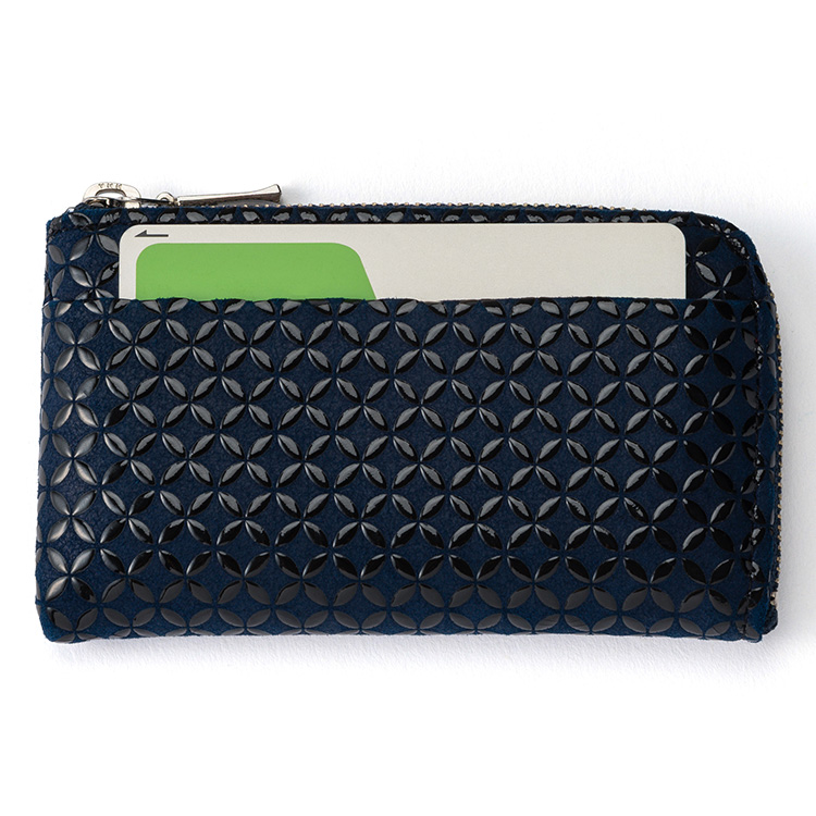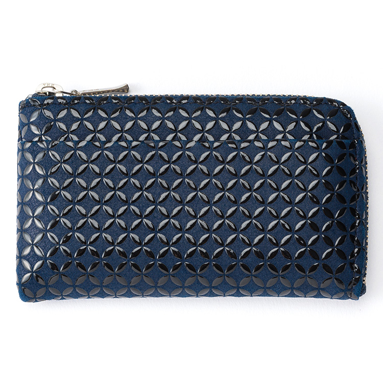 伝統工芸“甲州印伝”をまとった、コンパクトな小銭入れ。「円満な関係」を意味する七宝柄でゲン担ぎ!