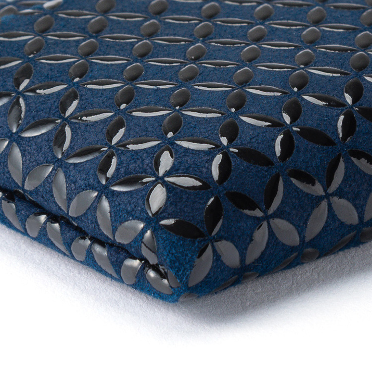 漆で描かれる多彩な文様も印伝の魅力。7種の宝(金、銀、瑠璃、玻璃、しゃこ、珊瑚、めのう)を示す「七宝柄」は、円が重なり合い無限に続くように見えることから“円満な関係”、“財力&運気アップ”のいわれを持っている。