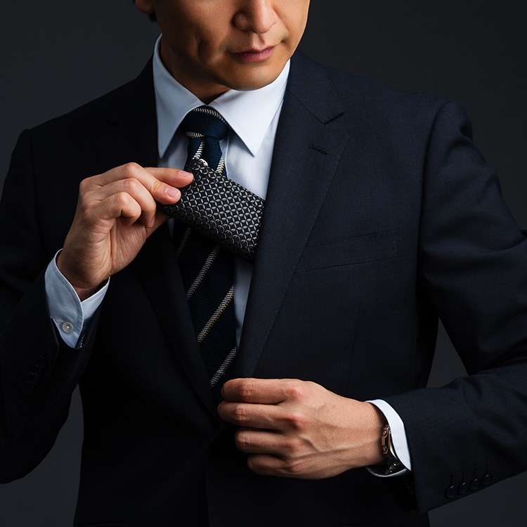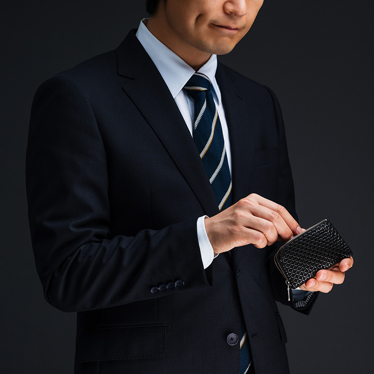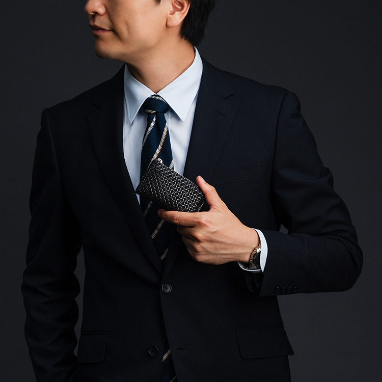 その一方で、印伝の連続した模様は非常に現代的な表情を持つ。その色・柄の特徴を生かしながら、よりスタイリッシュに仕上げたシリーズが「JIZAING×INDEN」だ。財布や合切袋、名刺入れが漆をまとうことでクールな印象になり、現代のファッションでも、なんら違和感なく持つことができる。