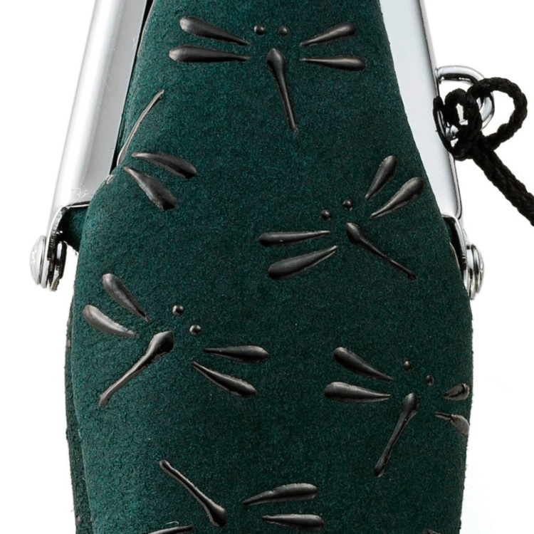 他の色と同様、グリーン革の印伝も「印傳屋 上原勇七」により手作業で作られる。高度な技術を必要とする印伝の漆付け技法は、和紙を手彫りした型紙を使用し、染色した鹿革に重ね、その上からヘラで漆を丁寧に刷り込んでいく。均一で美しい漆の立体感は究極の職人技だ。繊細な技から生まれる文様は、「小桜」、「とんぼ」の伝統の2柄に加えて、白漆のみ「青海波(せいがいは)も加わる。「小桜」は桜の華やかさ、潔い散り様から“精神の美しさ”を表し、桜好きな日本人の心に響く小紋柄。「とんぼ」は前にしか進まない虫なので、戦国武将たちの間では“勝ち虫”ととらえられ、鎧や装束の柄にも使われていたという勇ましい柄。「青海波」は海がもたらす恵みを呼び起こす縁起柄。どの柄も時間が経つほど漆の色が冴えて、深みのある落ち着いた光沢へと変化する。