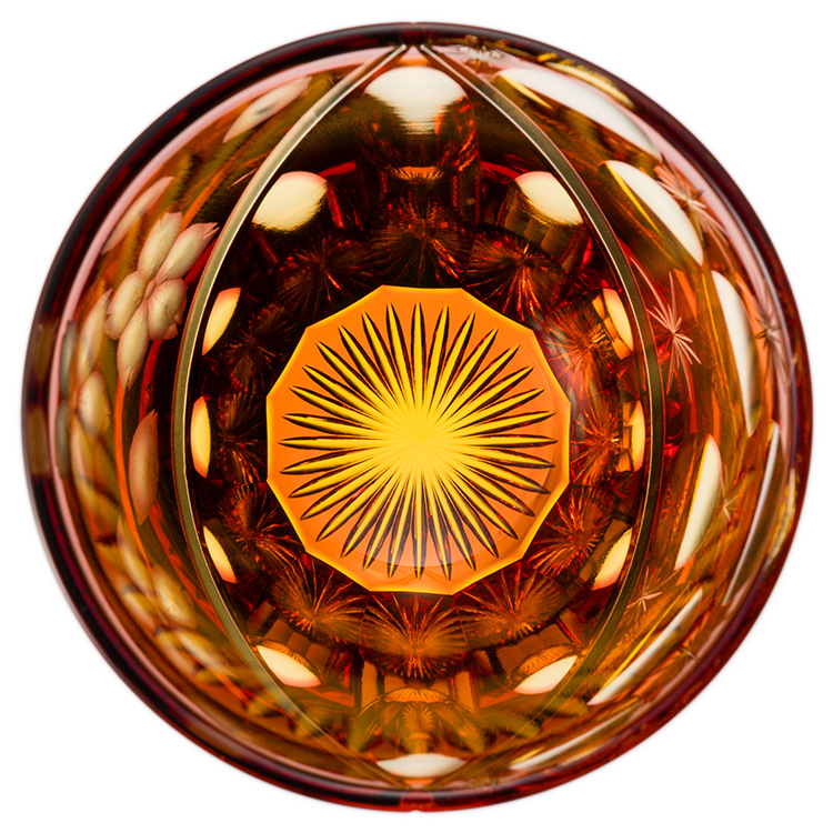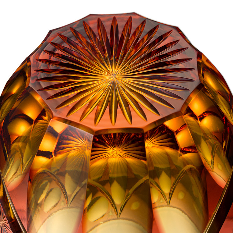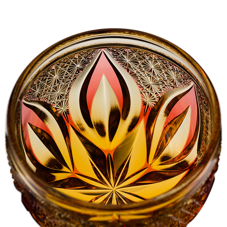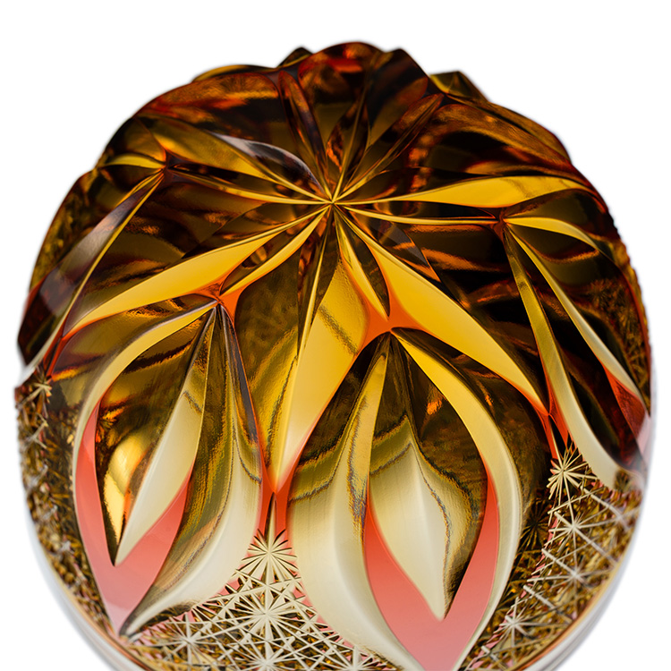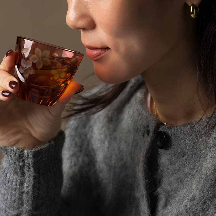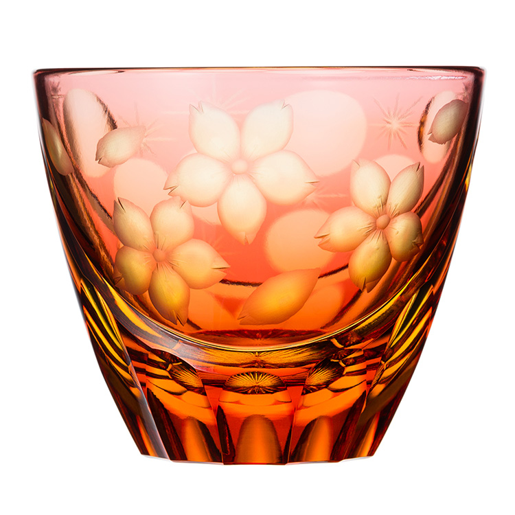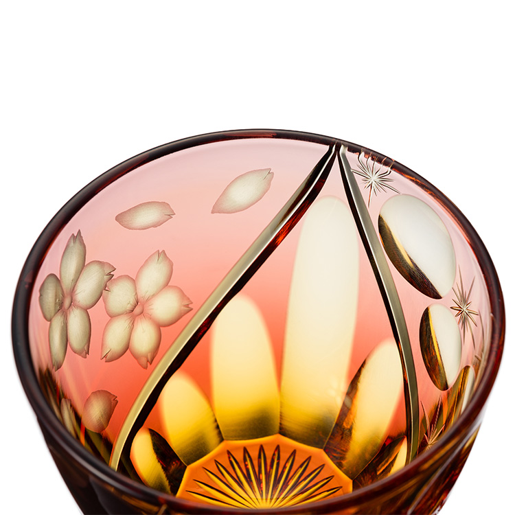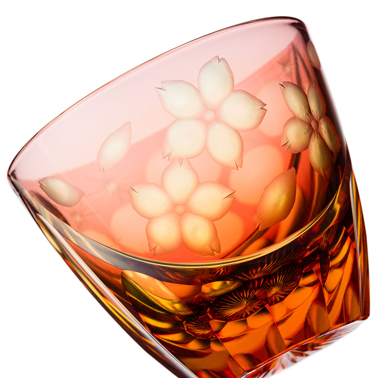 繫栄や豊かさ、五穀豊穣などを意味する「桜」紋様。春の訪れと一斉に咲き誇る様子から、新しいスタートや門出に相応しい柄としても知られる。リアルな桜の花は「花切子」の技法で表現されたもの。金赤×アンバーの柔らかな色合いにも心が躍る。