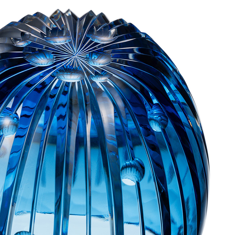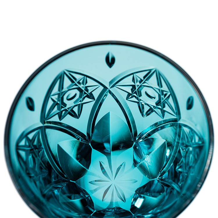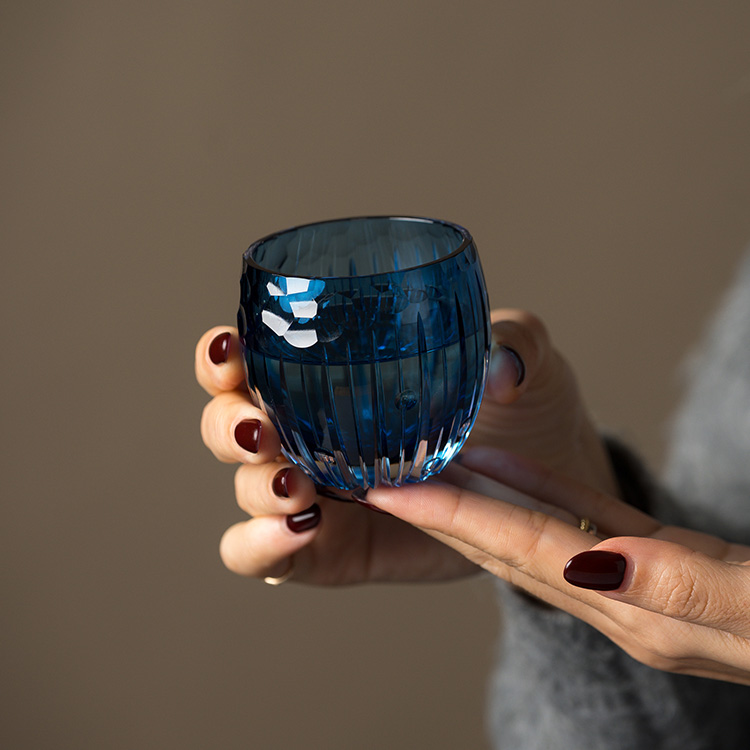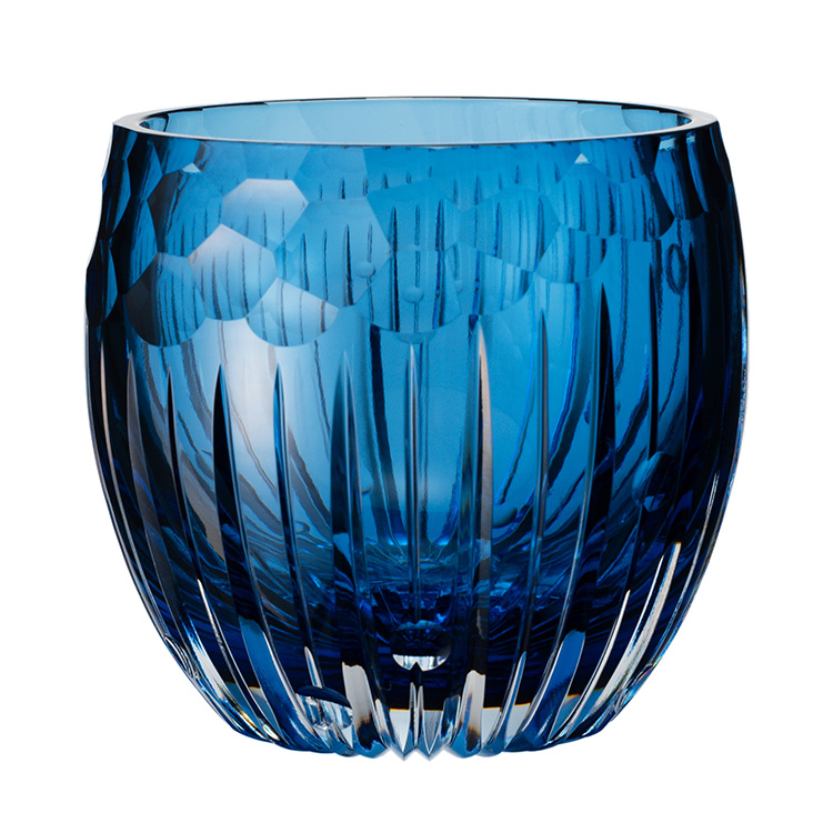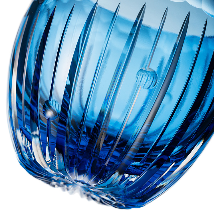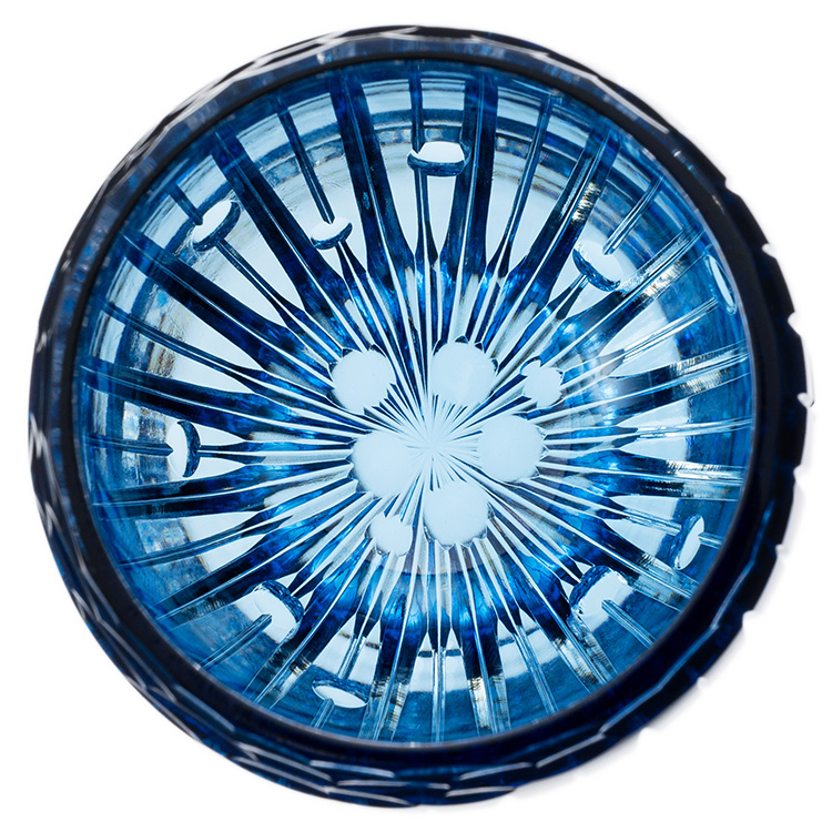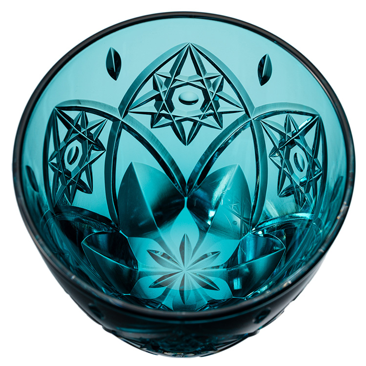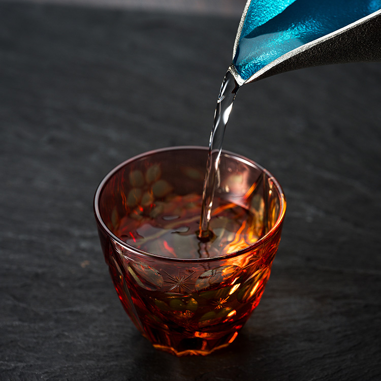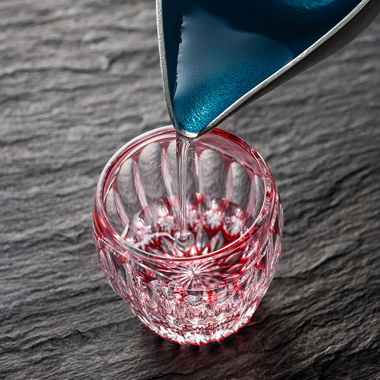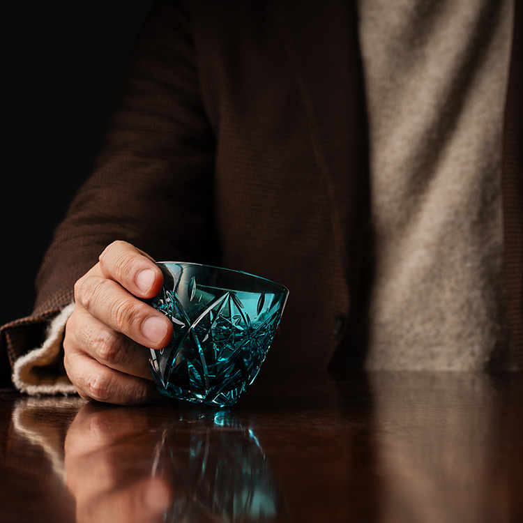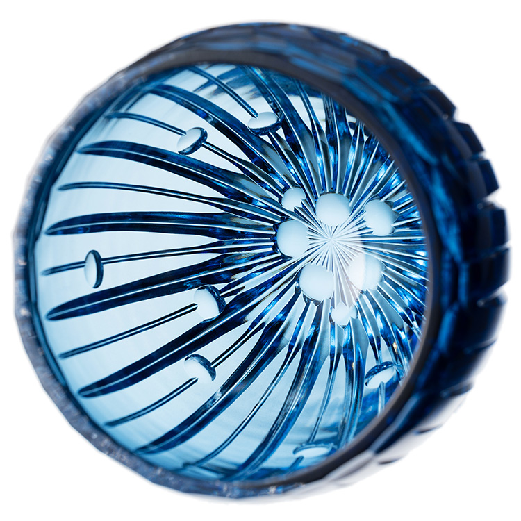 内被せのクリスタルガラスは、カットを施しても色が削られないのが特徴。日本酒を注げば“青を飲み干す”感覚を楽しめる。
