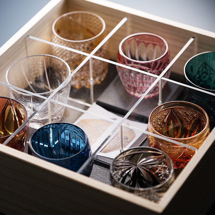 今回は、“開運”をモチーフにした江戸切子を八種類取り揃えました。専用の桐箱は置いておくだけでもサマになりますし、蓋を開ける瞬間は毎回ワクワクすることでしょう。