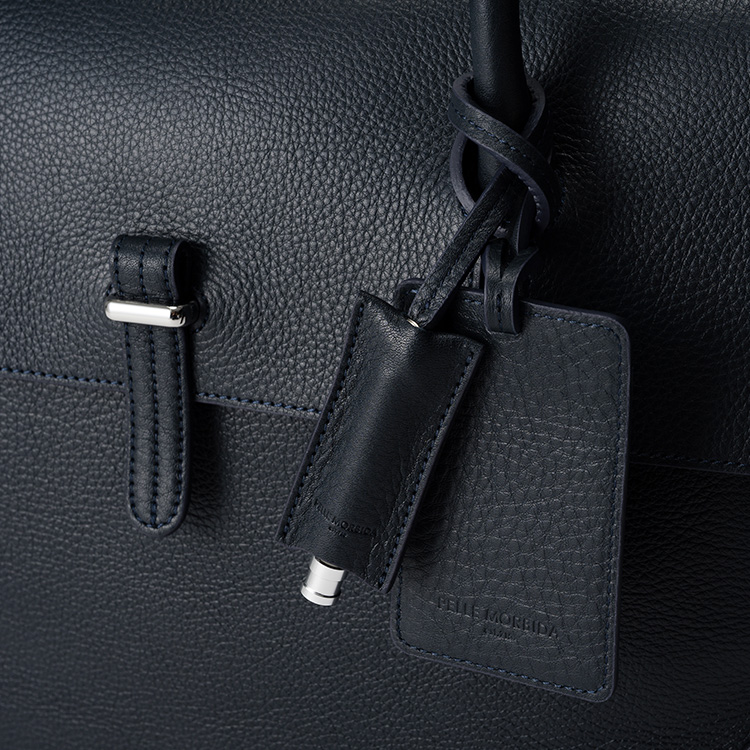 このデザインを支え、独特なオーラのもとになっているのが、ペッレ・モルビダのシグネイチャーであるシュリンクレザーだ。日本の皮革の一大産地、姫路のタンナーでなめされ、柔らかな風合いとコシで同ブランドの数々のバッグを彩ってきたこの革をフルに活用。スーツやジャケパンと調和しながら控えめに個性を主張して、高級感のあるスタイルを完成させる。