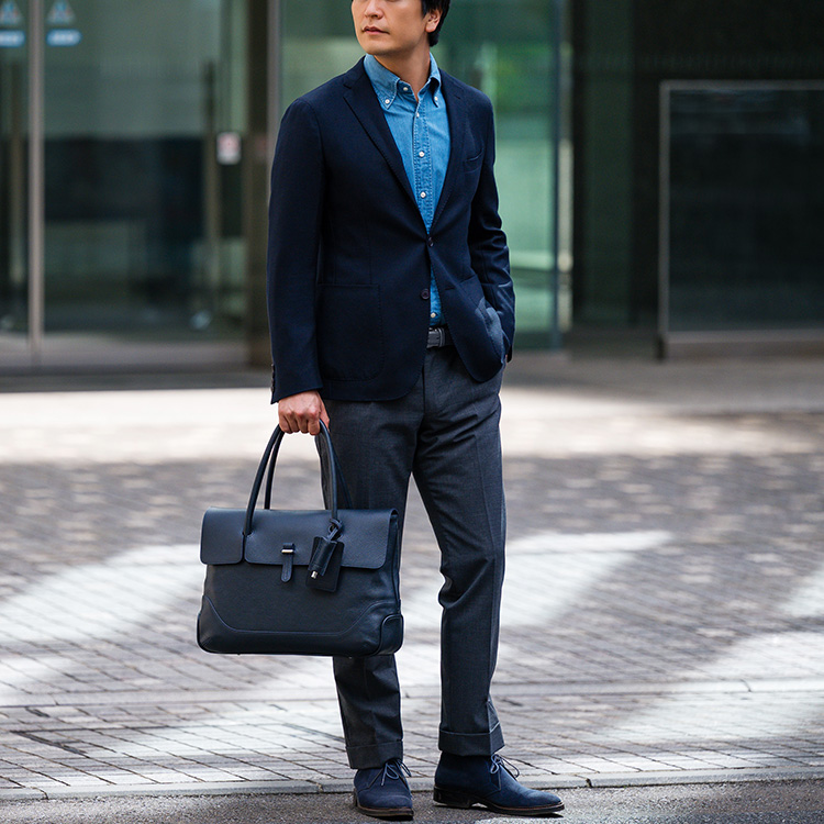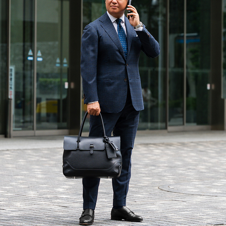 こうした素材や作りのこだわりを経ることで、バッグに唯一無二の色気が備わる。特にこのフラップデザインはクラシカルな印象が強まり、ビジネスファッションにピタリと寄り添ってくれる。スーツにもジャケパンにもスッと溶け込んで、安心感のある人物像を描き出してくれるだろう。