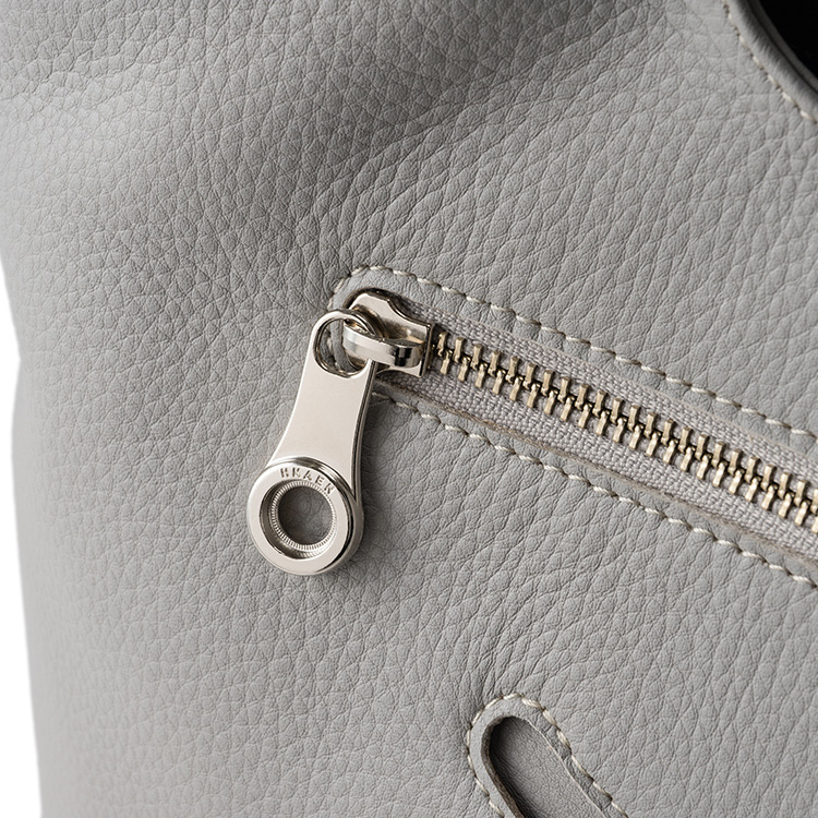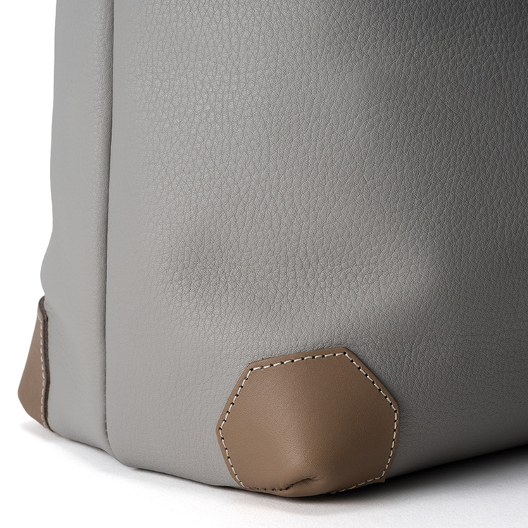 バッグが纏う圧倒的ラグジュアリー感のヒミツはこのレザー。これまで多くのオリジナルレザーを手掛けてきたHMAENだが、その中でも根強いファンが多いのがこの「Eシュリンク」である。柔らかくしっとりしたタッチは、何度も試作を重ね辿り着いたもの。「繊細なタッチはもちろん、その表情を損なわない色出しにも苦心しました」とデザイナー・大友氏は語る。“もっちり・しっとり”を追求した革は吸い付くようにボディに沿い、背負えばまるで体の一部のような感覚に。天然シュリンクのナチュラルなシボ感もまた格別である。