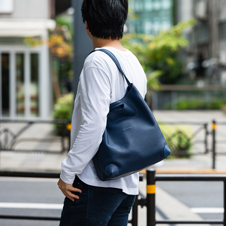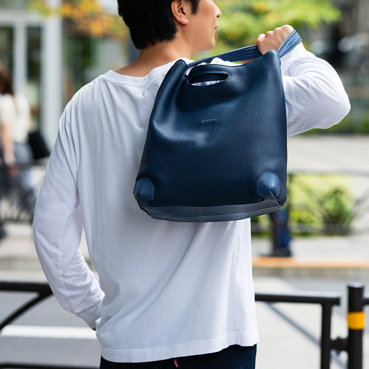「肩掛けに特化するなら、ワンハンドルが断然ラクだし便利」と大友氏。「ハンドルが一本なので肩からズレ落ちにくく、しっかりフィットします。ワンショルダー=レディースのイメージを持つ方もいるかもしれませんが、男性が持ってもバランスよくまとまるデザインになっています」と語る。実は、このサイズ感でメンズが悠々と肩掛けできるトートは探すとなかなか見つからない。ありそうでなかった“ニーズの隙間”をつくバッグが、HMAENのひらめきによってここにまたひとつ誕生した。