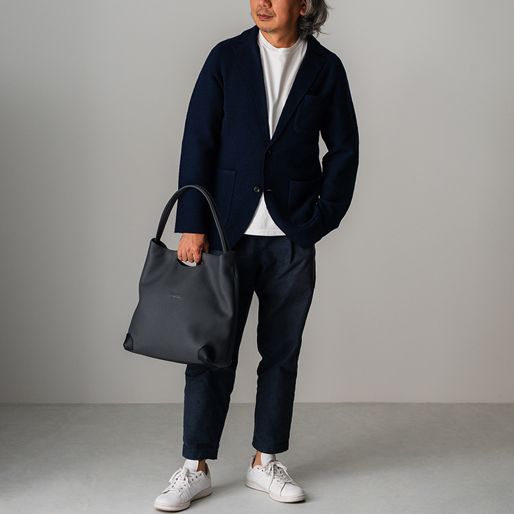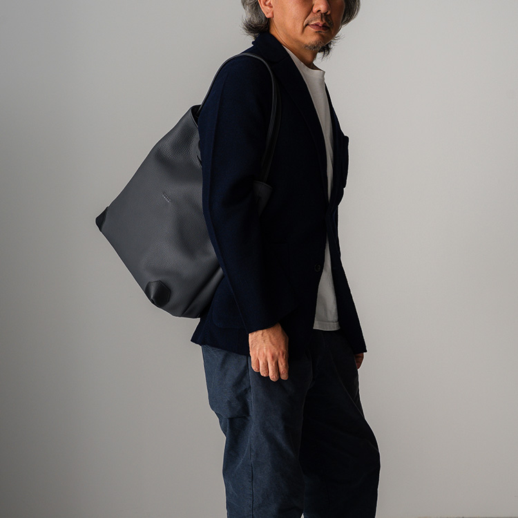 トートの名は「SNUGGLE EDITORS TOTE(スナグル エディターズ トート」。エディターズトートとは、海外のファッションエディターが愛用したことからその名がついた、収納力と高いデザイン性を兼ね備えたトートのこと。「イメージしたのは、荷物をどさっと入れて、パッと担いで動けるトート。従来のビジネストートよりもコンパクトに、かつ大判トートのようにザクッと持ち運べる、そんなバッグを目指しました」とデザイナー・大友成氏は語る。