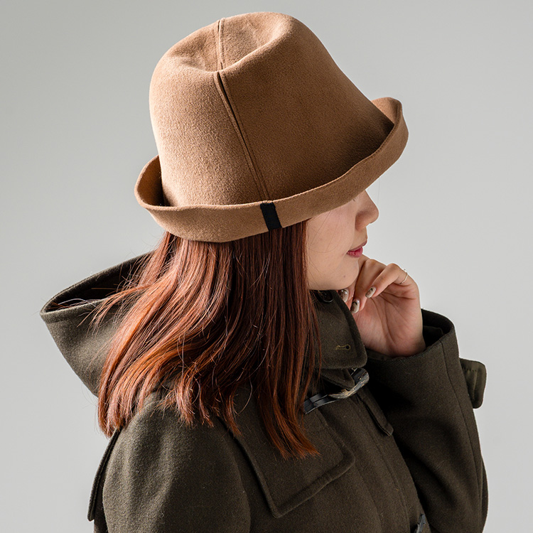 このラビットフェルトを、帽子作りの伝統的な技術と経験を有する日本の職人が手作業で仕立て、美しい帽子に仕立てる。独特の光沢感がある素材と、職人仕立ての精巧な技術の掛け算によって、ハットからなんともいえない色気が漂い、帽子スタイルを大人っぽくする。使い続けるほどに自分の頭にフィットしていき、愛着も増していくことだろう。毛流れが乱れたり、くせがついてしまった場合もスチームアイロンなどの蒸気を当てたあとに軽くブラッシングをするだけでOK。手入れの簡単さも魅力だ。