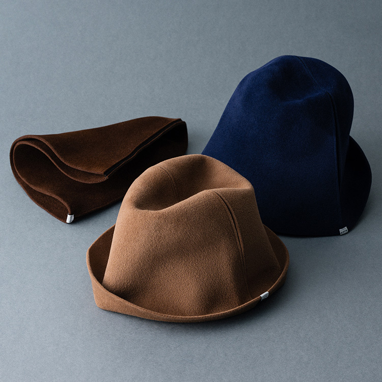 「着こなしは十人十色なのに、帽子のデザインは初めから完成されたものばかり。ユーザーが自分の思うままにかぶることができる、そんな“余白”のある帽子があってもいいのではないかと思ったんです」。そしてメイドインジャパンにもこだわる。日本の職人の確かな技術によって作り出される帽子たちは、国内の大手百貨店をはじめ、パリの有名セレクトショップにも置かれ、海外からも高く評価されている。