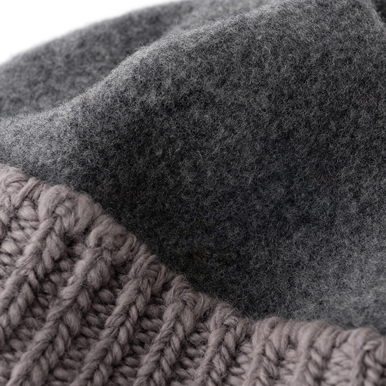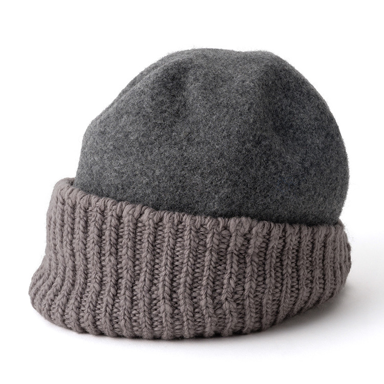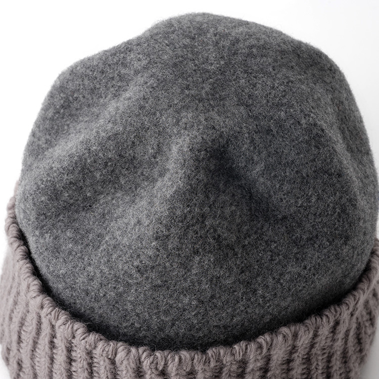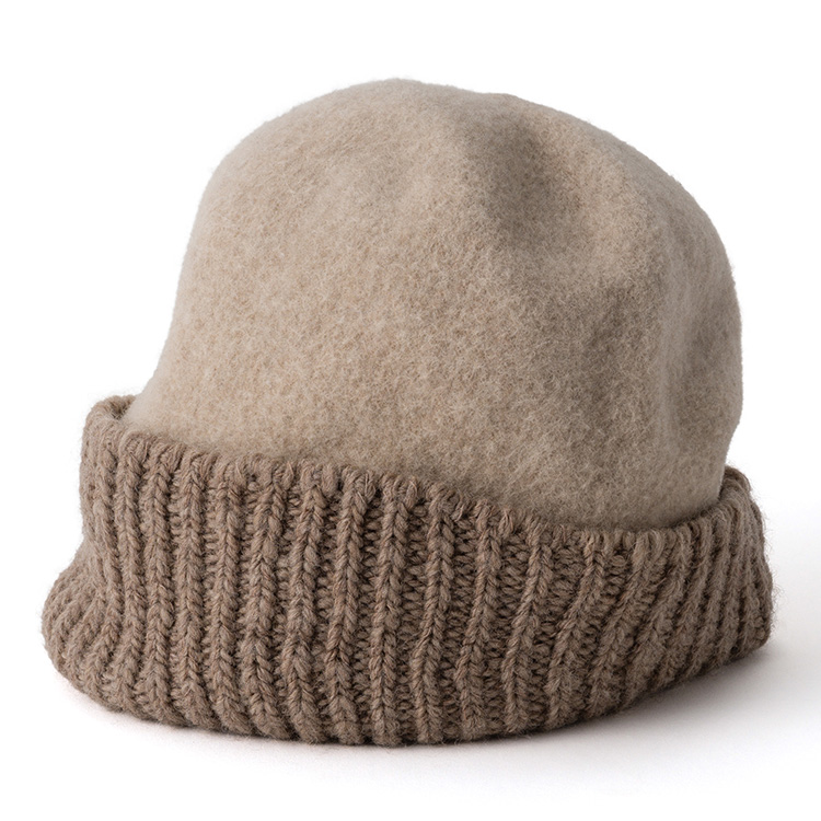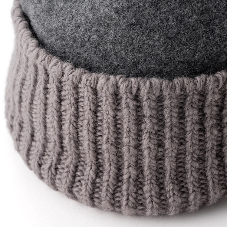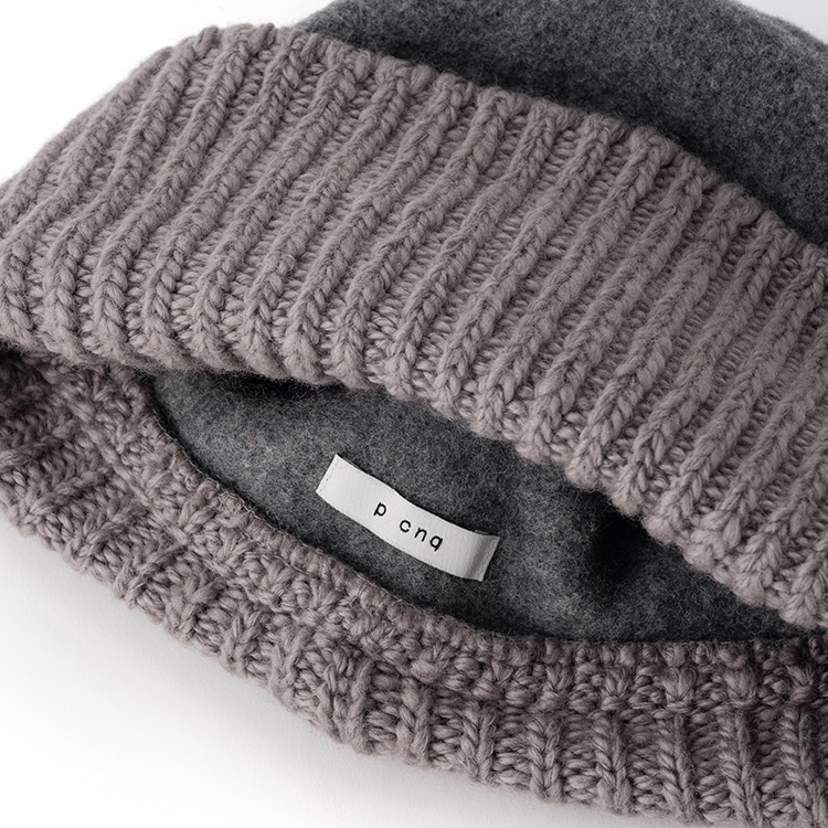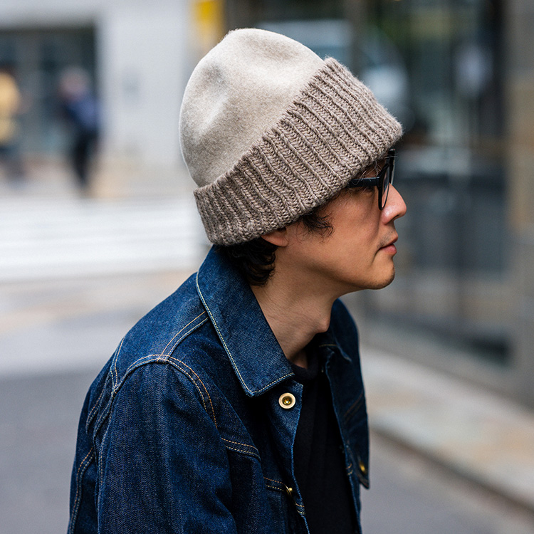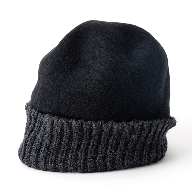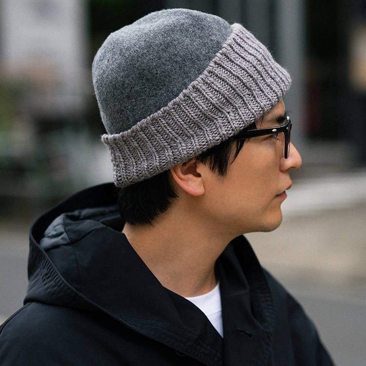 まぎれもなく「ウールの帽子」なのだが、リブ編みと圧縮ウールの異製法ミックスにより、遊び心に満ちたユニークな個性を獲得した。