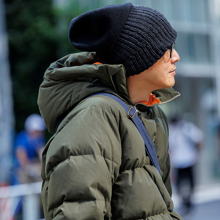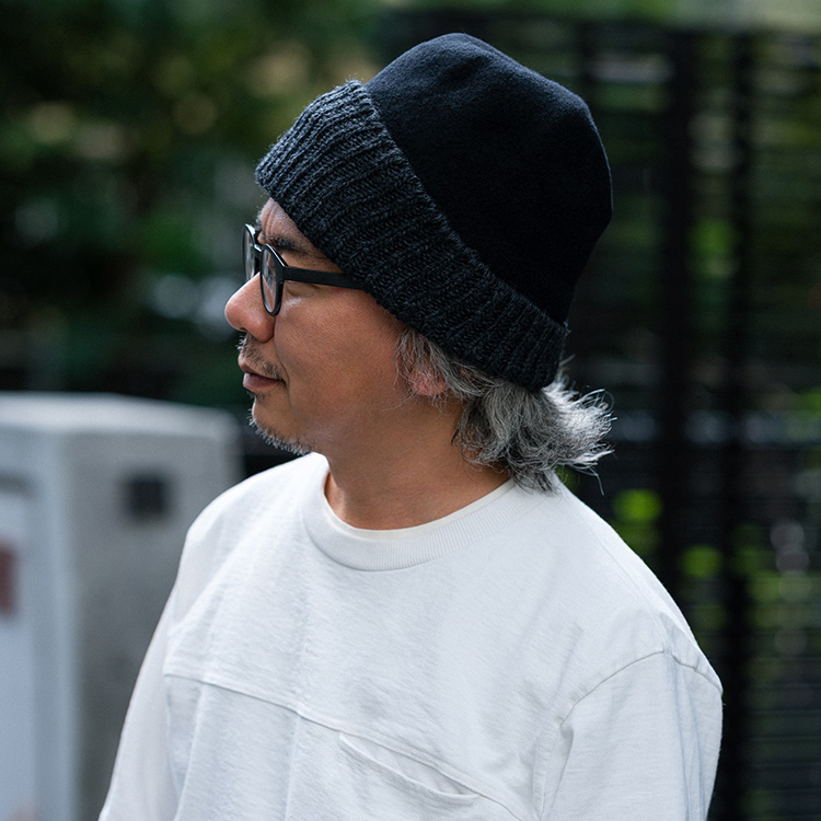 「ウールを使って異素材風に見せるにはどうしたらいいか? と考えて作ったのがこのデザイン。リブを調節したりして、自分で見せ方をアレンジしながら楽しんでいる方が多いです。他にはない帽子だからか、海外のショップでも人気があるんですよ」。