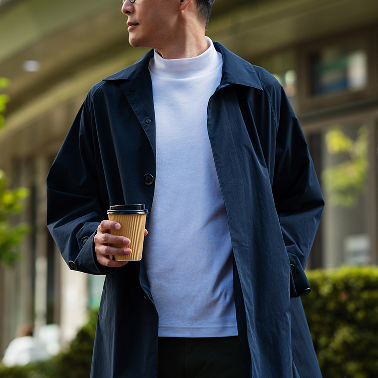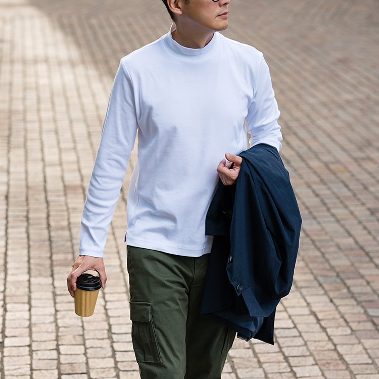 ジャケット以外にも、コートやフリース、ダウンなどとも好相性。室内でアウターを脱いでも様になる。インナーがモックネックであることで首回りに冷たい空気が入りにくいのも利点だ。秋はネックのある長袖Tシャツのように使い、冬になったらインナーにして、春まで楽しもう。