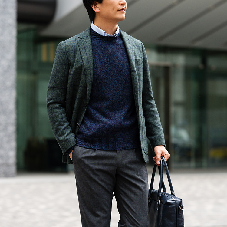 寄って見ればその複雑な色構成がわかり、離れて見ても独特なノイジー感を放っていて、只者ではない雰囲気が伝わってくる。ドレスではないがカジュアルすぎてもいない「品格あるカジュアル」といった様子。このようなカシミヤニットの風合いを、これまでに見たことがあるだろうか? いや、ない!