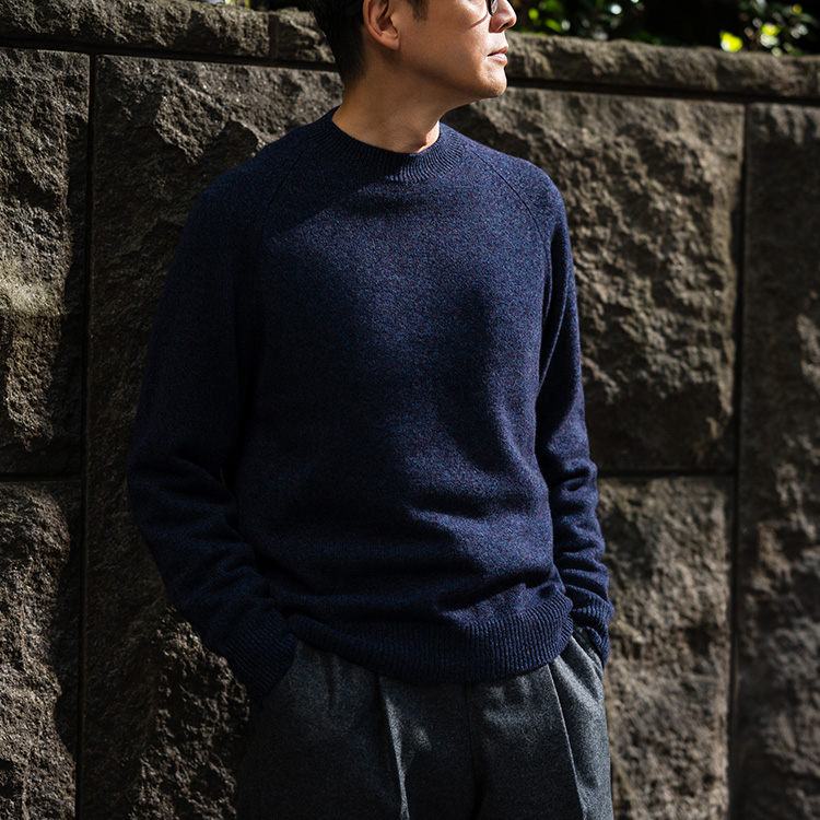 通常ではあり得ないほどの量の糸を使い、ふっくらと肉厚で、軽妙なクラッシュカラーをたたえたカシミヤニットは、他では成立するわけがない。そこにモックネックの襟が加わり、いよいよ誰も辿り着けないプロダクトに到達した。