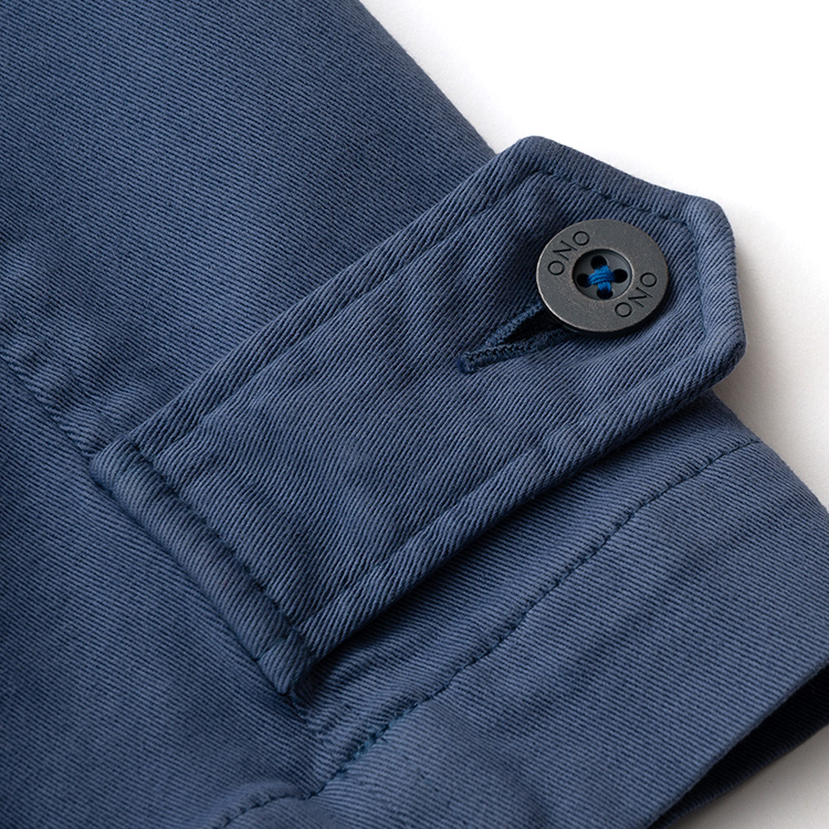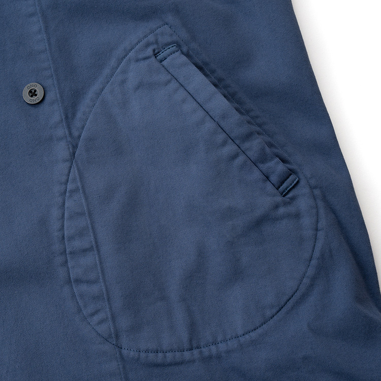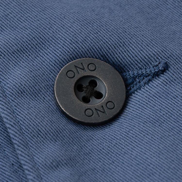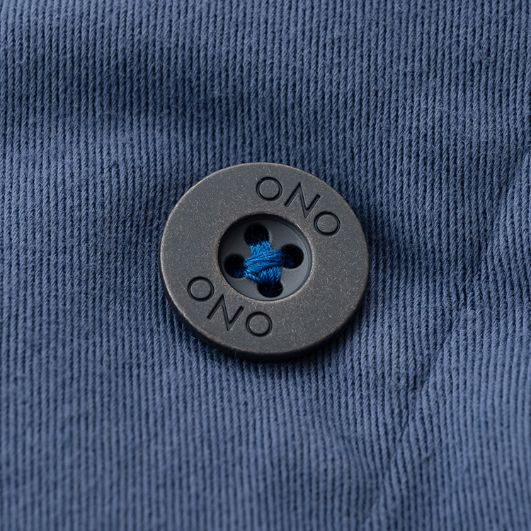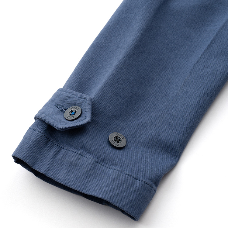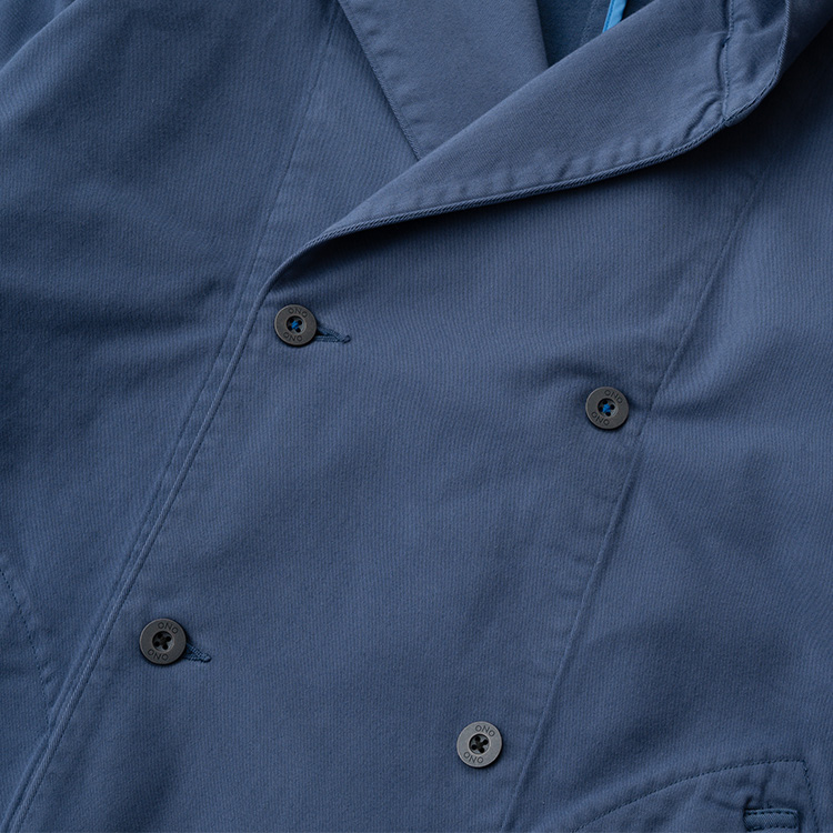 同様のこだわりはボタンにも。フロントの一番上のボタンと、袖のボタンのみに水色の糸を使っている。