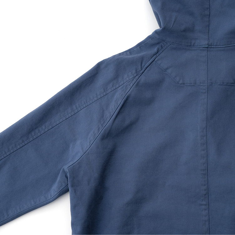 肩はラグランスリーブで動かしやすく。ジャケットを着ても肩が合わないことがなく、自然な羽織り感を生む。