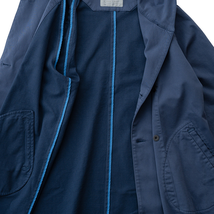 裏地なしの一枚仕立て。内側の水色のパイピングは、コートを脱いでかけてある時でも素敵に見えるこだわりだ。通常はこうした見えない部分はロック仕上げでいいものを、わざわざキレイに始末するのはファクトリーブランドのプライドである。