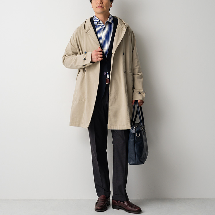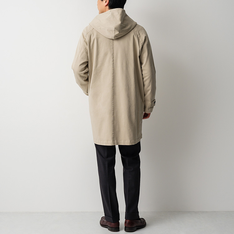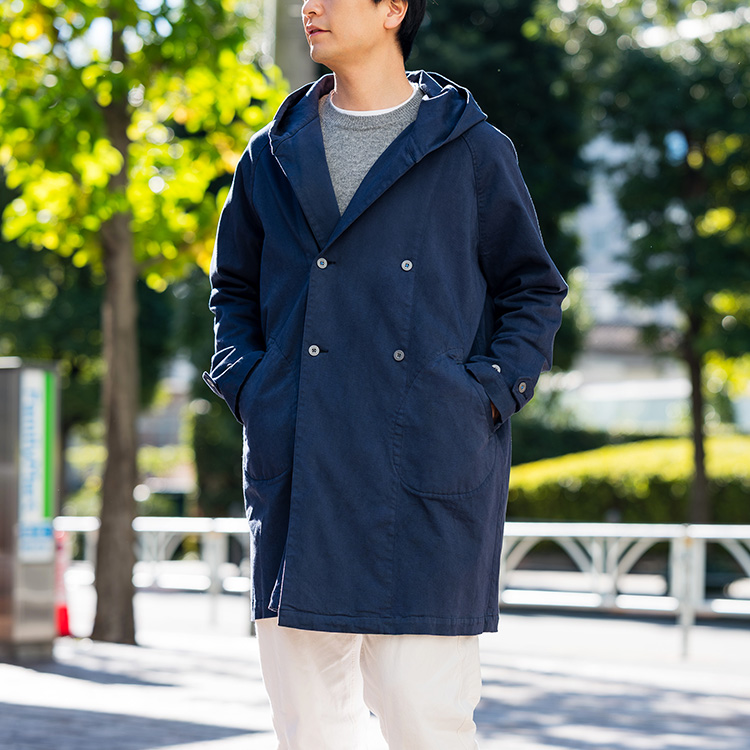 こちらは一見、軽く羽織れるコットン主体のコートだが、実は体温調節ができる高機能素材の「アウトラスト®」をミックスしており、春・秋・冬のロングシーズンで活躍する万能モデル。