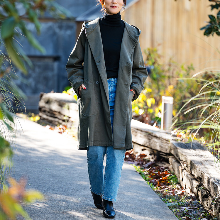 ユニセックスサイズであり、実は女性が着ても素敵。袖をロールアップすればオーバーサイズなコートとして使える。パートナーで共用するのも大いにありだ。
